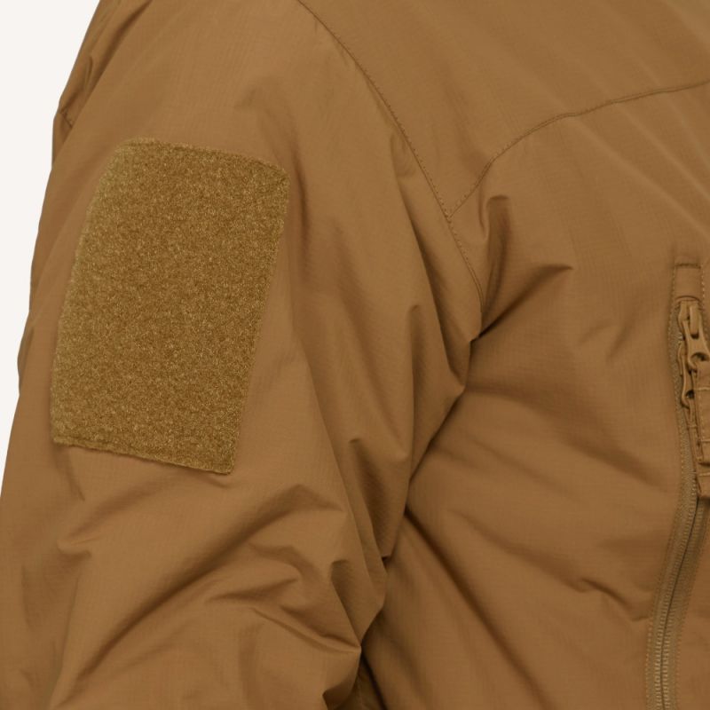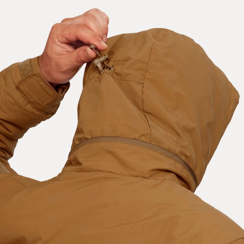 Утеплитель гидрофобный - быстро сохнет при намокании. Внешний нейлоновый слой защищает утеплитель от ветра и воды, при этом обеспечивает дышащий эффект. Воротник вмещает в себя капюшон, регулируемый шнурками, доступными из карманов на груди. Карман для капюшона застегивается на двухстороннюю молнию. Это важно для доступа к капюшону без необходимости снимать тяжелые перчатки. Мягкая флисовая подкладка капюшона повышает комфорт при ношении и предотвращает натирание. Два кармана на груди с флисовой подкладкой защищают руки от обморожений. Молнии на больших боковых карманах обеспечивают доступ даже при ношении тяжелых варежек.