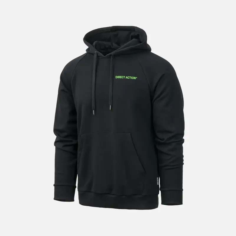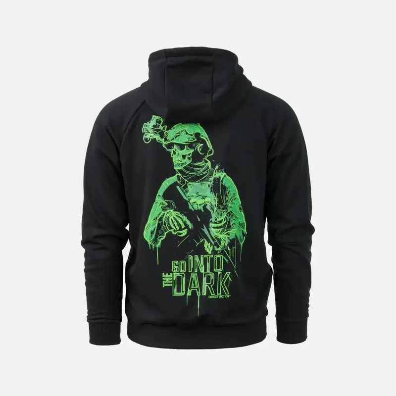 Толстовка с капюшоном в стиле милитари со скелетом на черном фоне.