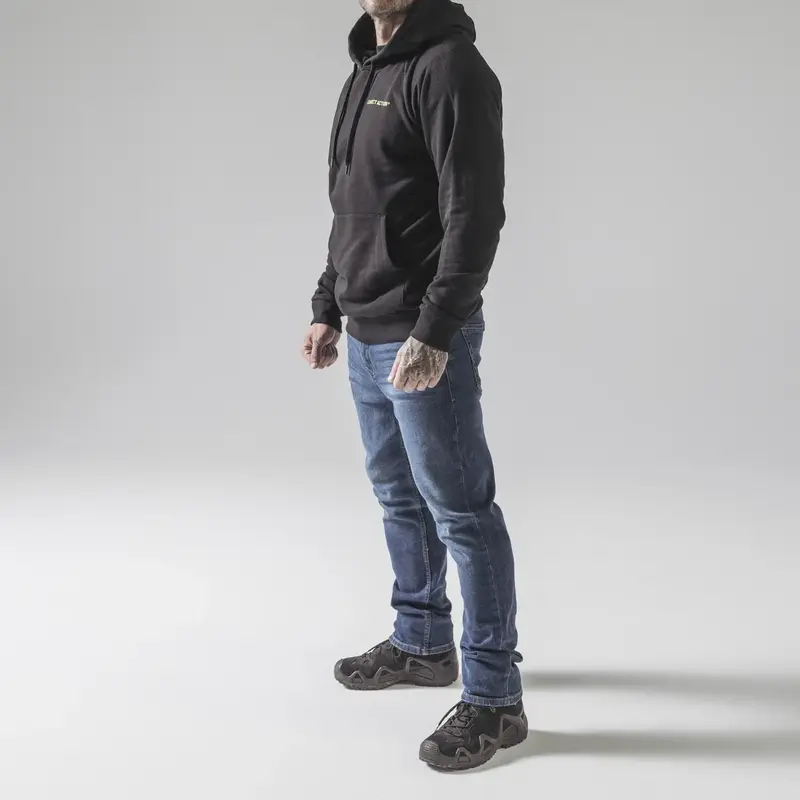Толстовка с капюшоном в стиле милитари со скелетом на черном фоне.