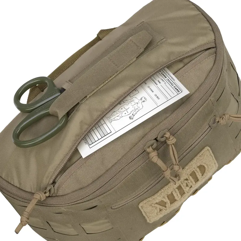 На клапане есть два кармана - один для травматологических ножниц, а другой для карточки TCCC. Вырезанные лазером панели MOLLE/PALS по бокам обеспечивают места крепления дополнительного снаряжения, такого как держатели для жгутов или различные медицинские сумки. На нижней панели также имеются прорези MOLLE и амортизационный шнур для крепления боевых носилок или других более громоздких предметов.