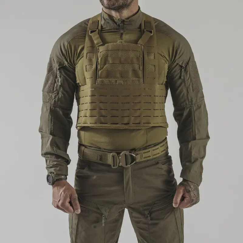 Изготовлен из фирменного ламината и прочной сетки,Четыре внутренних кармана закрываются небольшими накладками Velcro®,Складная нагрудная панель,Интерфейс для стабилизации баллистической на передней панелиПодтяжки имеют вырезы для дополнительных вариантов крепления