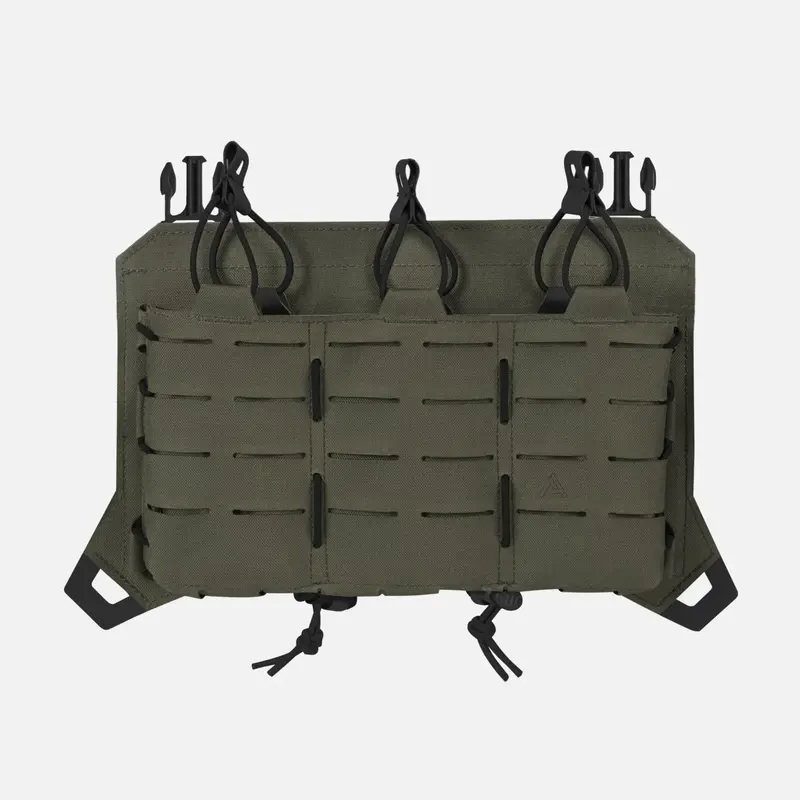 ТРОЙНОЙ КЛАПАН МАГАЗИНА ВИНТОВКИ имеет одна из дополнительных заслонок, доступных для системы SPITFIRE®.ых для системы SPITFIRE®. Регулируемый тройной подсумок для винтовки, пришитый непосредственно к клапану, позволяет носить три магазина для винтовок AR, AK или SR на платформе. Магазины также крепятся сверху с помощью эластичных шнуров с противоскользящими фиксаторами Hypalon®. Клапан почти полностью изготовлен из фирменного ламината, который не только гарантирует долговечность, но и немного жестче, чем стандартная Cordura®, что позволяет легко убирать магазины в кобуру. Передняя поверхность откидной створки покрыта системой лазерной резки, совместимой с MOLLE/PALS, что обеспечивает дополнительную модульность. Откидная створка совместима с пластиночными креплениями SPITFIRE®, SPITFIRE® MK II и HELLCAT®. Клапан может быть прикреплен к держателю пластины через специальные отверстия в клапане или с помощью прилагаемых пряжек.