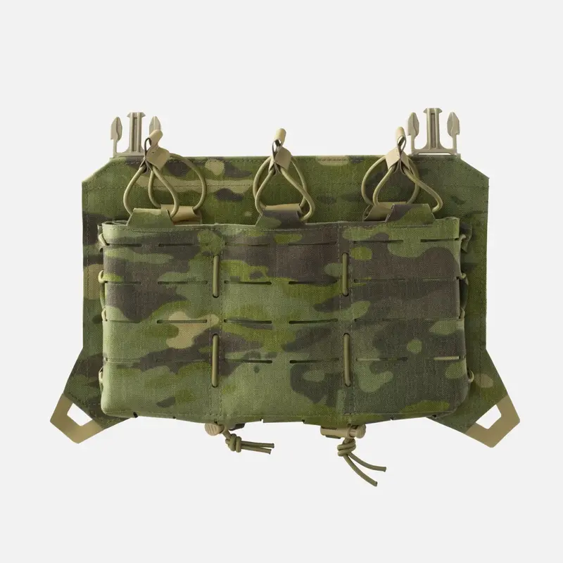 ТРОЙНОЙ КЛАПАН МАГАЗИНА ВИНТОВКИ имеет одна из дополнительных заслонок, доступных для системы SPITFIRE®.ых для системы SPITFIRE®. Регулируемый тройной подсумок для винтовки, пришитый непосредственно к клапану, позволяет носить три магазина для винтовок AR, AK или SR на платформе. Магазины также крепятся сверху с помощью эластичных шнуров с противоскользящими фиксаторами Hypalon®. Клапан почти полностью изготовлен из фирменного ламината, который не только гарантирует долговечность, но и немного жестче, чем стандартная Cordura®, что позволяет легко убирать магазины в кобуру. Передняя поверхность откидной створки покрыта системой лазерной резки, совместимой с MOLLE/PALS, что обеспечивает дополнительную модульность. Откидная створка совместима с пластиночными креплениями SPITFIRE®, SPITFIRE® MK II и HELLCAT®. Клапан может быть прикреплен к держателю пластины через специальные отверстия в клапане или с помощью прилагаемых пряжек.