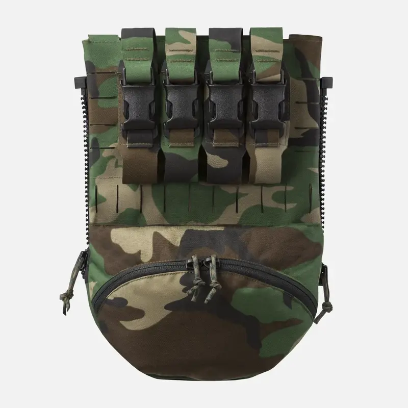 Сама панель служит в качестве тонкого транспортировочного рукава для гидратационной камеры или инструментов для вскрытия отверстий. Застежка на крючок и петлю внизу открывается для размещения более длинных инструментов, таких как кувалды, которые можно переносить вертикально и закреплять сверху.
