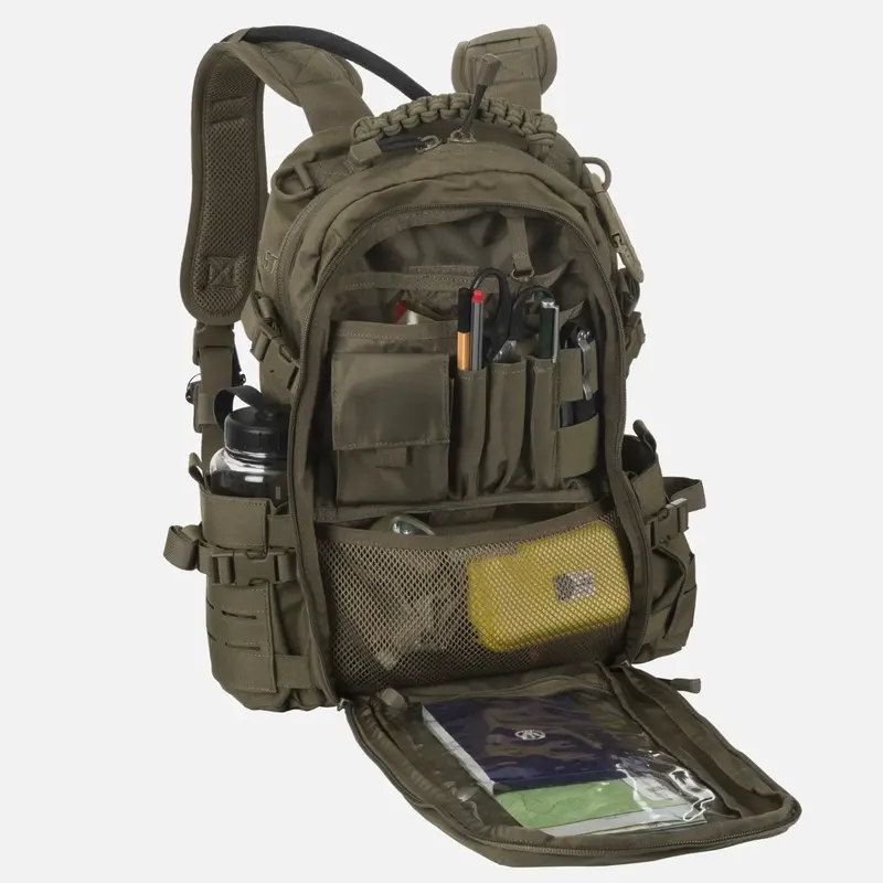 Конструкция из ламината Cordura 500DСпереди и по бокам нанесена лазерная резка PALS/MOLLE Карман для гидратационного пузыряМягкий чехол для компьютераТканый 550 ручка для переноски на шнуреВентилируемая задняя панель - Combat Vent System®Петлевая панель для персонализации