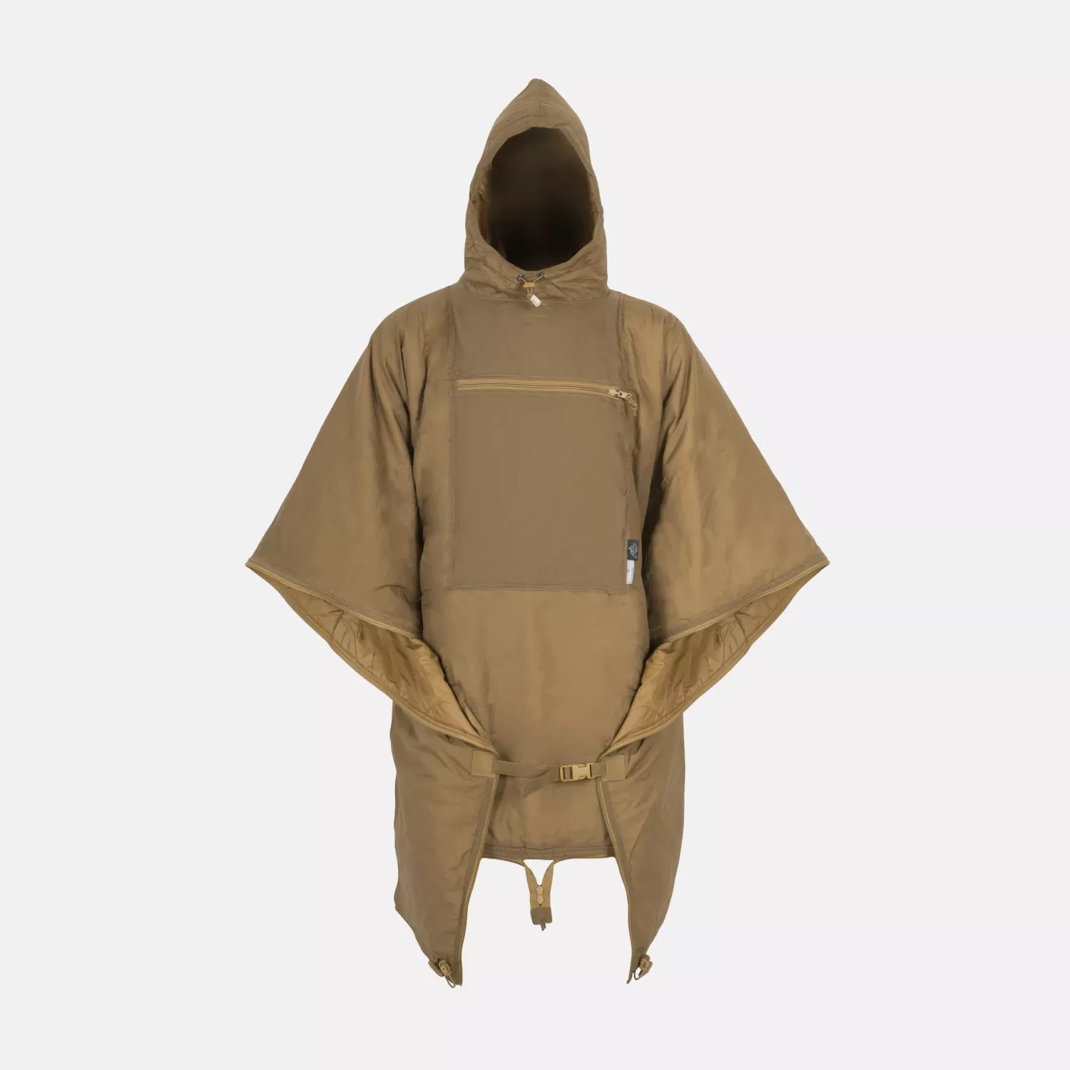 В отличие от пуха, утеплитель из синтетического волокна сохраняет тепло даже во влажном состоянии и не сбивается в комки. Пончо можно стирать в стиральной машине. Утеплитель легкий, эффективный, дышащий и компактный.