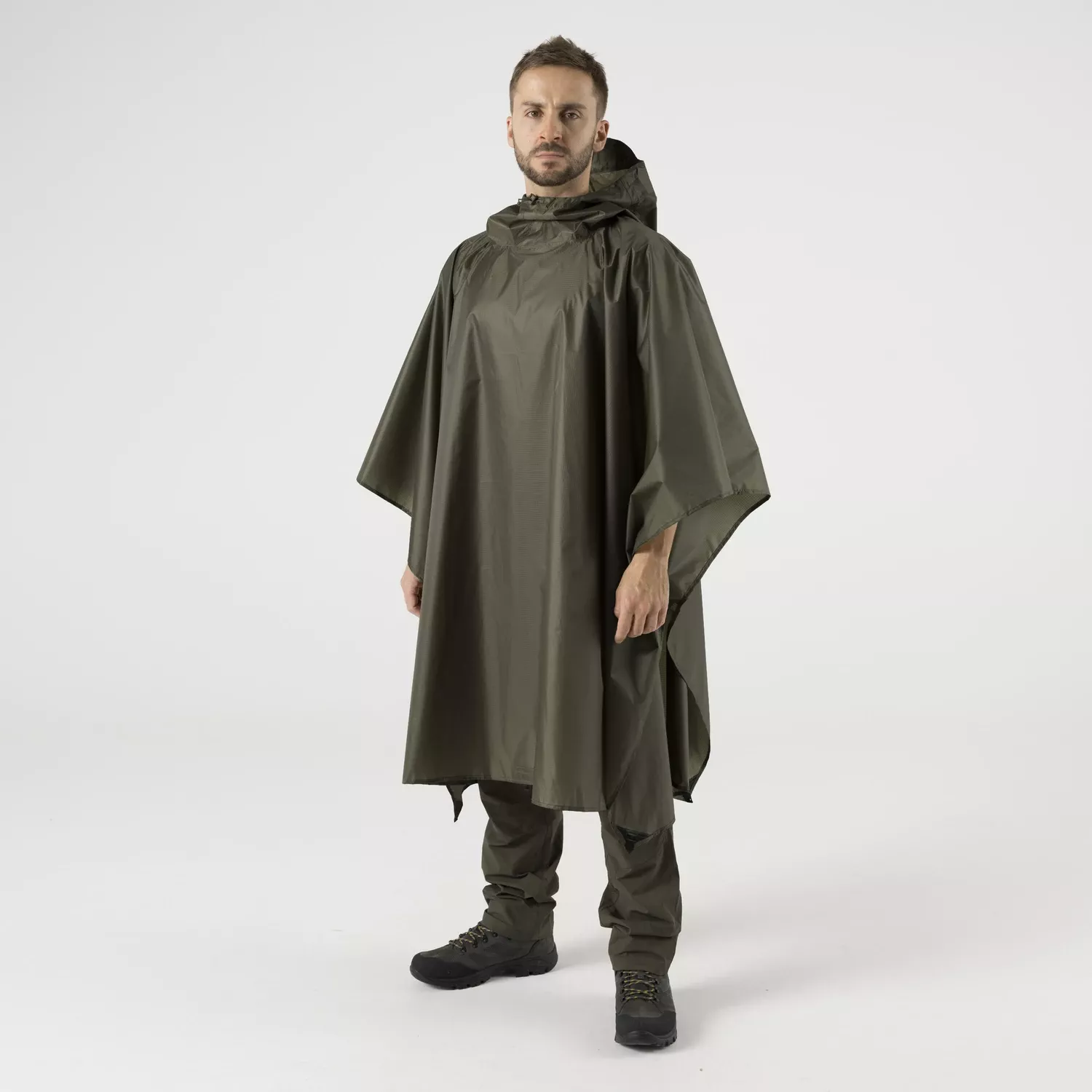 Накидка имеет две кнопки, которые позволяют сделать рукава, чтобы они не развевались на ветру при ношении на теле. Новый тип капюшона имеет практичный регулятор на шнурке, который работает намного лучше, чем оригинальный. Легкое пончо можно сложить и упаковать в прилагаемый чехол. Все точки крепления усилены специальной износостойкой тканью.