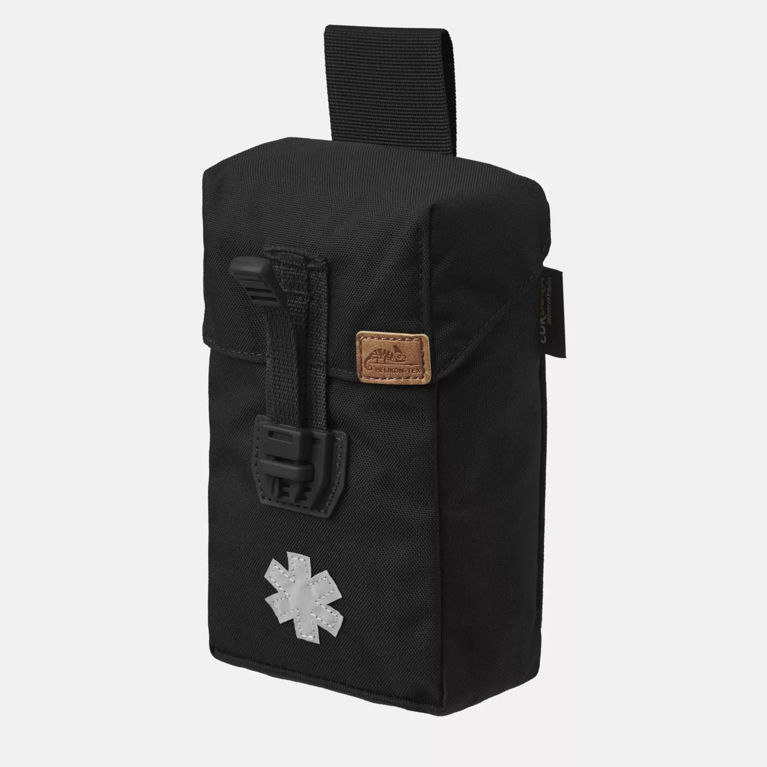 Аптека состоит из прямоугольного футляра с жесткой задней стенкой. Внутри находится съемная вставка с ручкой для быстрого доступа, которую также можно носить отдельно. Она включает отделения для давящей повязки, личной повязки и бинта. В центре вставки находится съемный карман на молнии из эластичного материала.