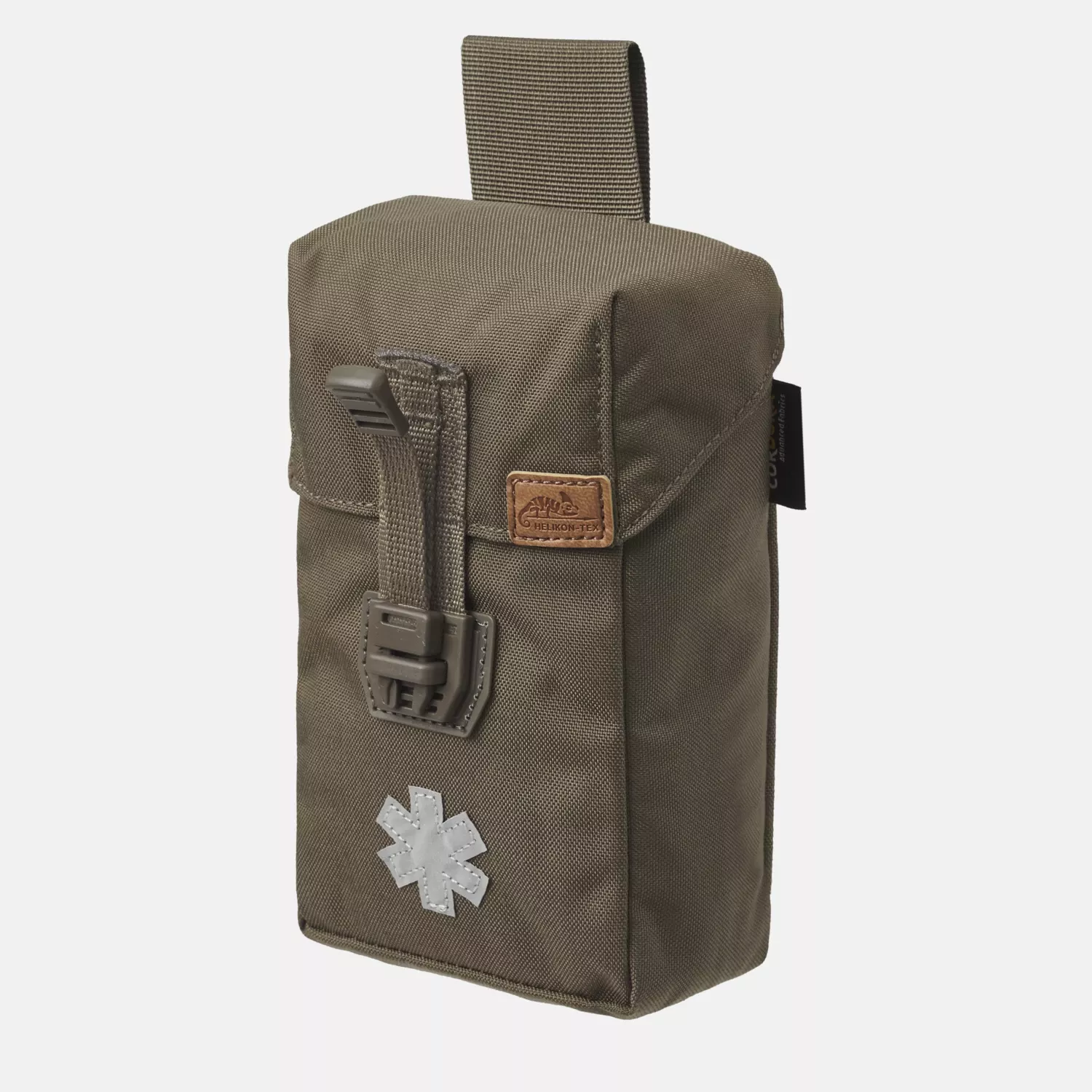 Аптека состоит из прямоугольного футляра с жесткой задней стенкой. Внутри находится съемная вставка с ручкой для быстрого доступа, которую также можно носить отдельно. Она включает отделения для давящей повязки, личной повязки и бинта. В центре вставки находится съемный карман на молнии из эластичного материала.