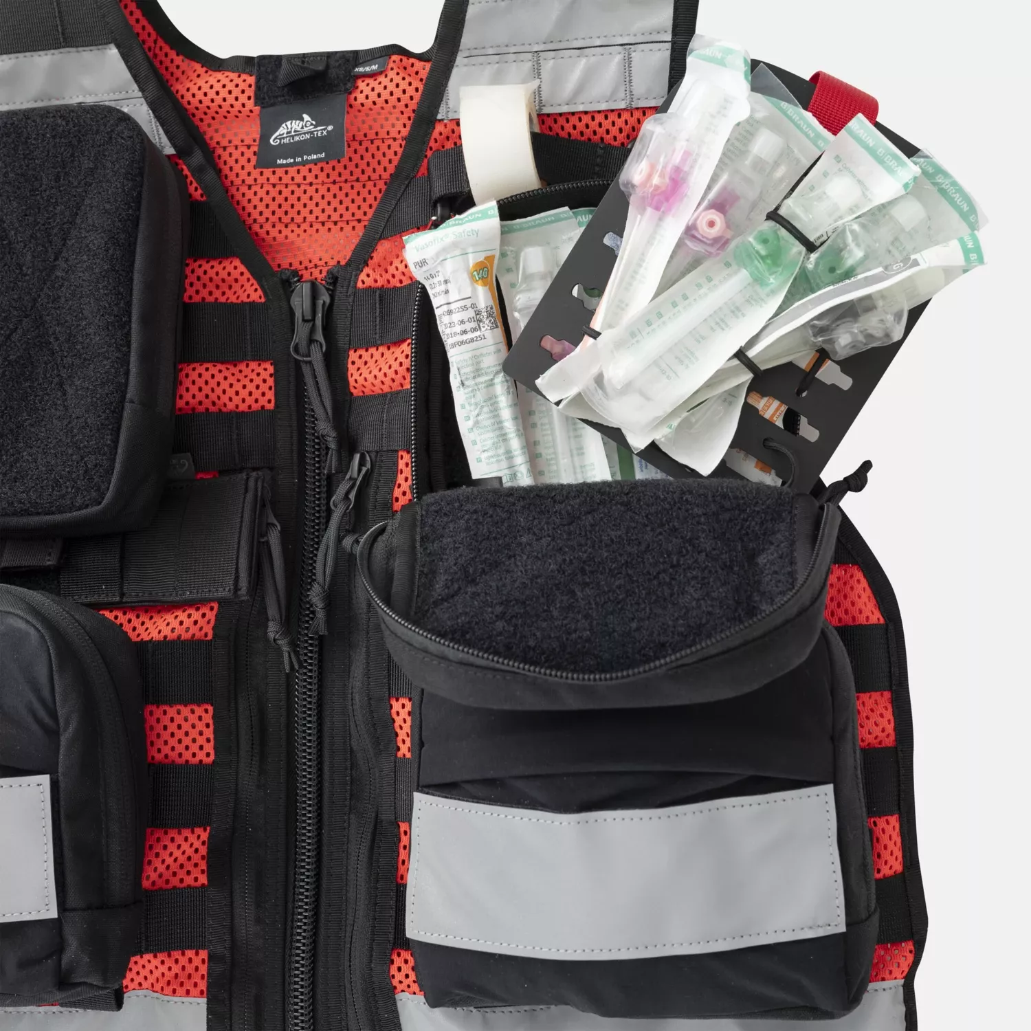 Передний карман среднего размера с липучкой для обозначения выполняемой роли в машине скорой помощи. Внутри находится уменьшенная версия пластиковой вставки, похожая на ту, что находится в большом подсумке SAR. Изначально предполагалось разместить его над жилетом, но есть возможность расположить его в любом месте жилета.