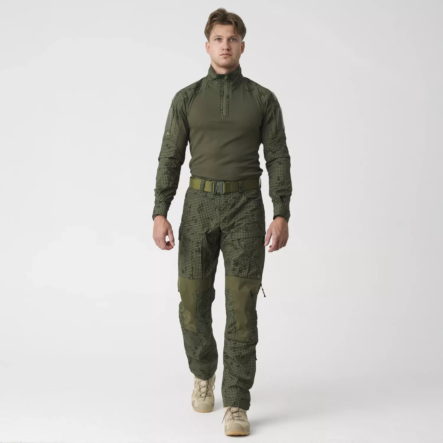 Сочетание хлопка и полиэстера обеспечивает воздухопроницаемость, быстрое высыхание и износостойкость. В то же время добавление эластана обеспечивает двустороннюю эластичность — необходимую при динамичных движениях как в городских, так и в полевых условиях.