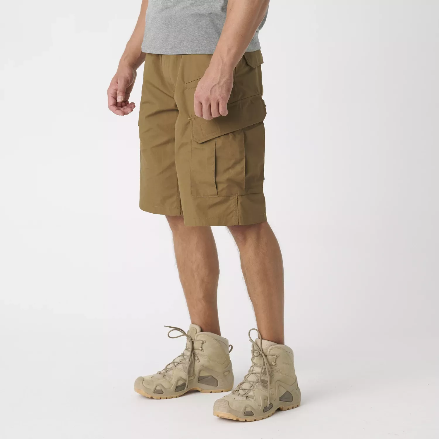 Восемь практичных карманов в этих военных шортах позволяют удобно носить с собой повседневное снаряжение. Два классических набедренных кармана вмещают нож или фонарик. Два небольших передних кармана предназначены для мелких предметов снаряжения, таких как смартфон. Два набедренных кармана с застежкой на липучке, пуговицах и шнурке могут служить подсумками для пустых магазинов. Дополнительные петли для карабинов пришиты под передними петлями для ремня.