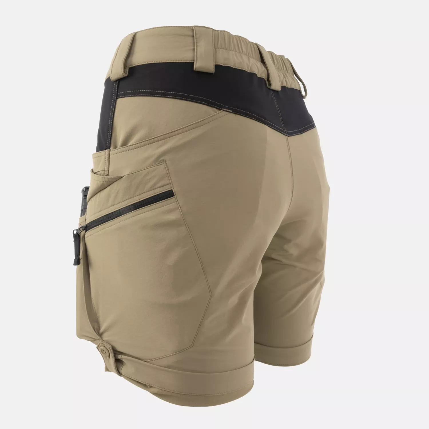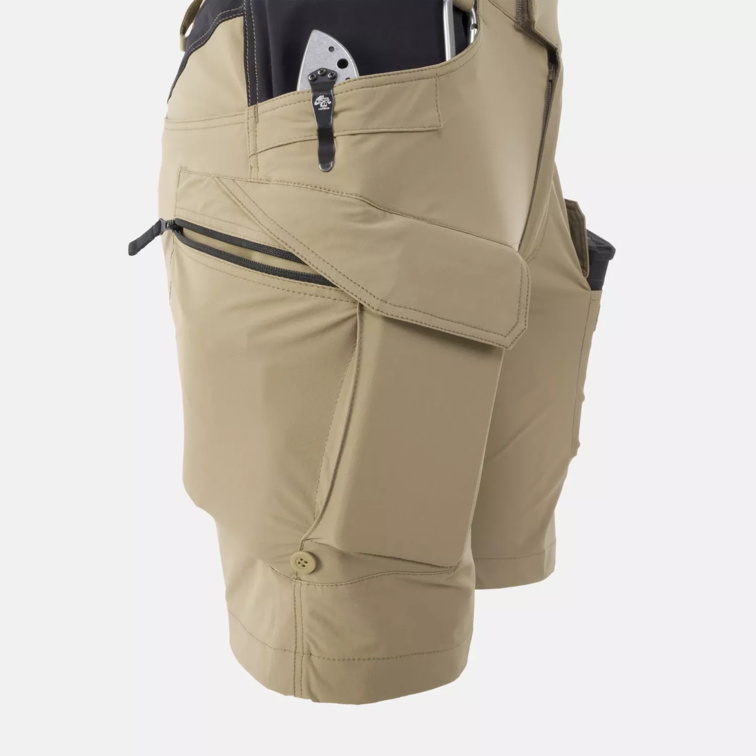 Эти шорты имеют восемь карманов: два классических сетчатых (с усилением для складного ножа), два набедренных кармана-карго, два передних кармана на липучках и два плоских врезных кармана сзади.