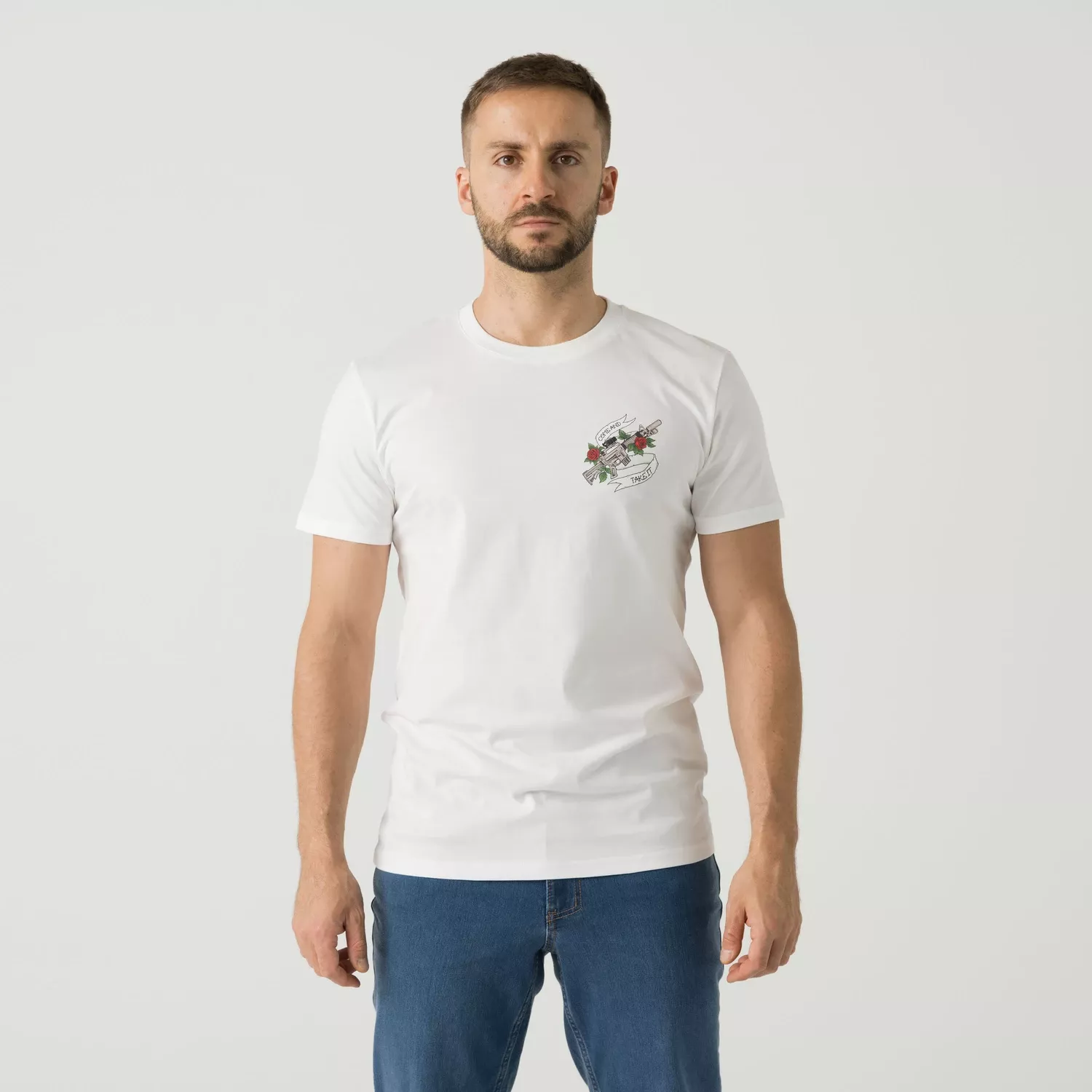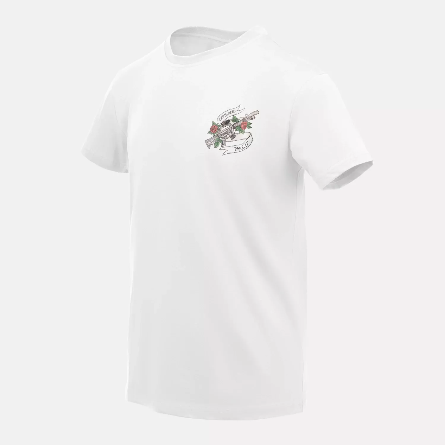 Классическая хлопковая футболка с тактическим мотивом.Отличительная форма футболок развилась в начале 20-го века из предшествующего нижнего белья (известного как комбинезон). После Второй мировой войны хлопковые футболки в форме буквы Т стали очень популярны, отчасти благодаря Марлону Брандо и Джеймсу Дину, которые носили их на экране.