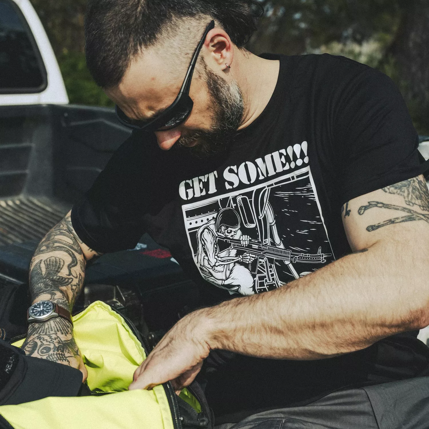 Иногда одного крика достаточно, чтобы войти в историю. Футболка Get some! отдает дань уважения культовой сцене из фильма «Цельнометаллическая оболочка» (1987) режиссера Стэнли Кубрика, в которой солдат, которого играет Тим Колчери, стреляет из вертолета, выкрикивая легендарное «Get some!». Это отсылка к легендарному моменту в военном кино и бескомпромиссному подходу к действию.
