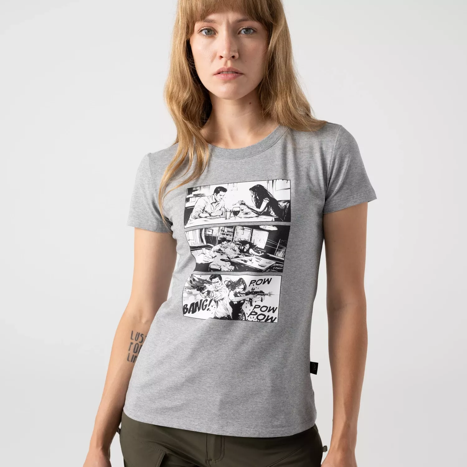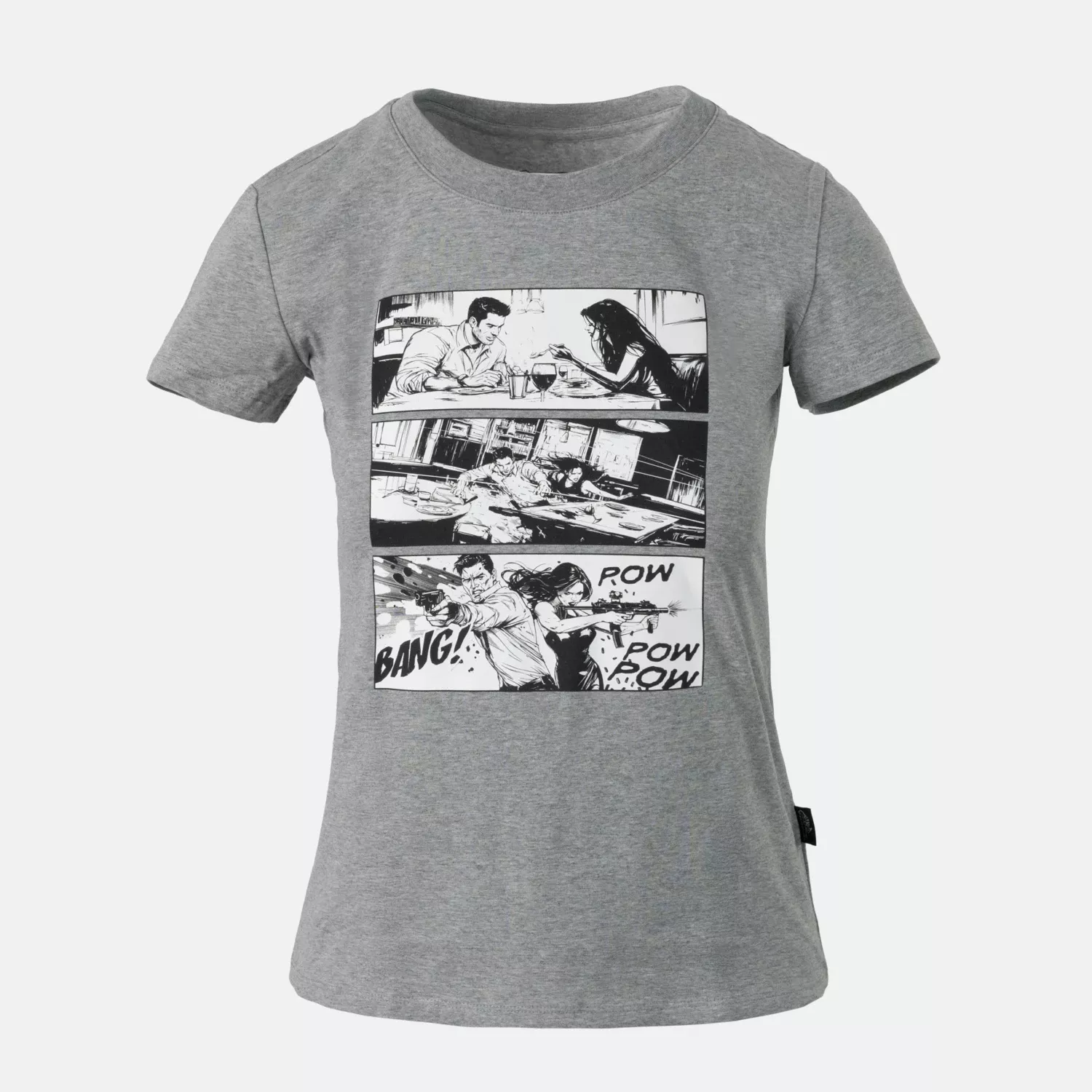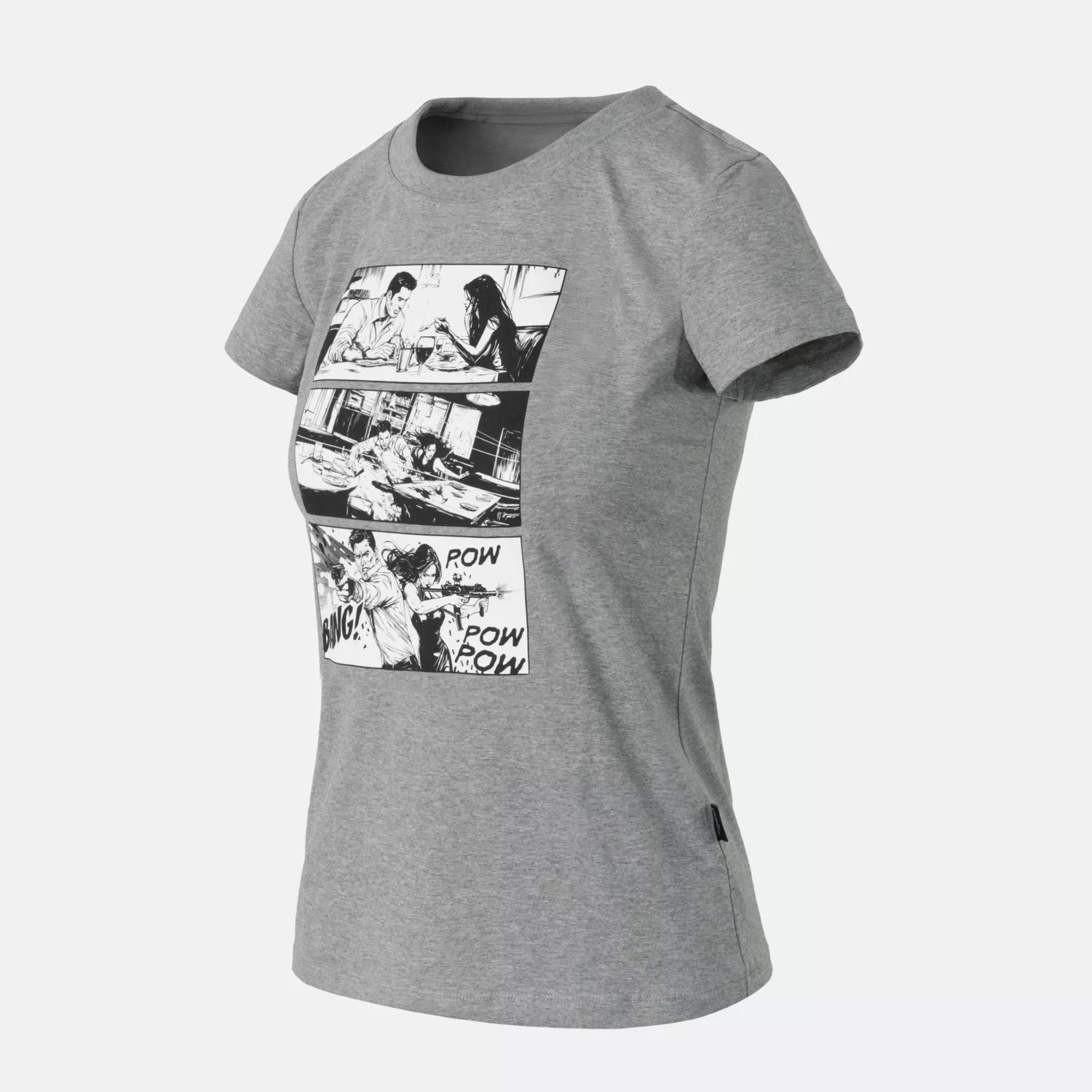 Женская облегающая футболка с изображением тактического комикса. Характерная форма футболок развилась в начале 20-го века из предшествующего нижнего белья (известного как комбинезон). После Второй мировой войны хлопковые футболки в форме буквы Т стали очень популярны, отчасти благодаря Марлону Брандо и Джеймсу Дину, которые носили их на экране.