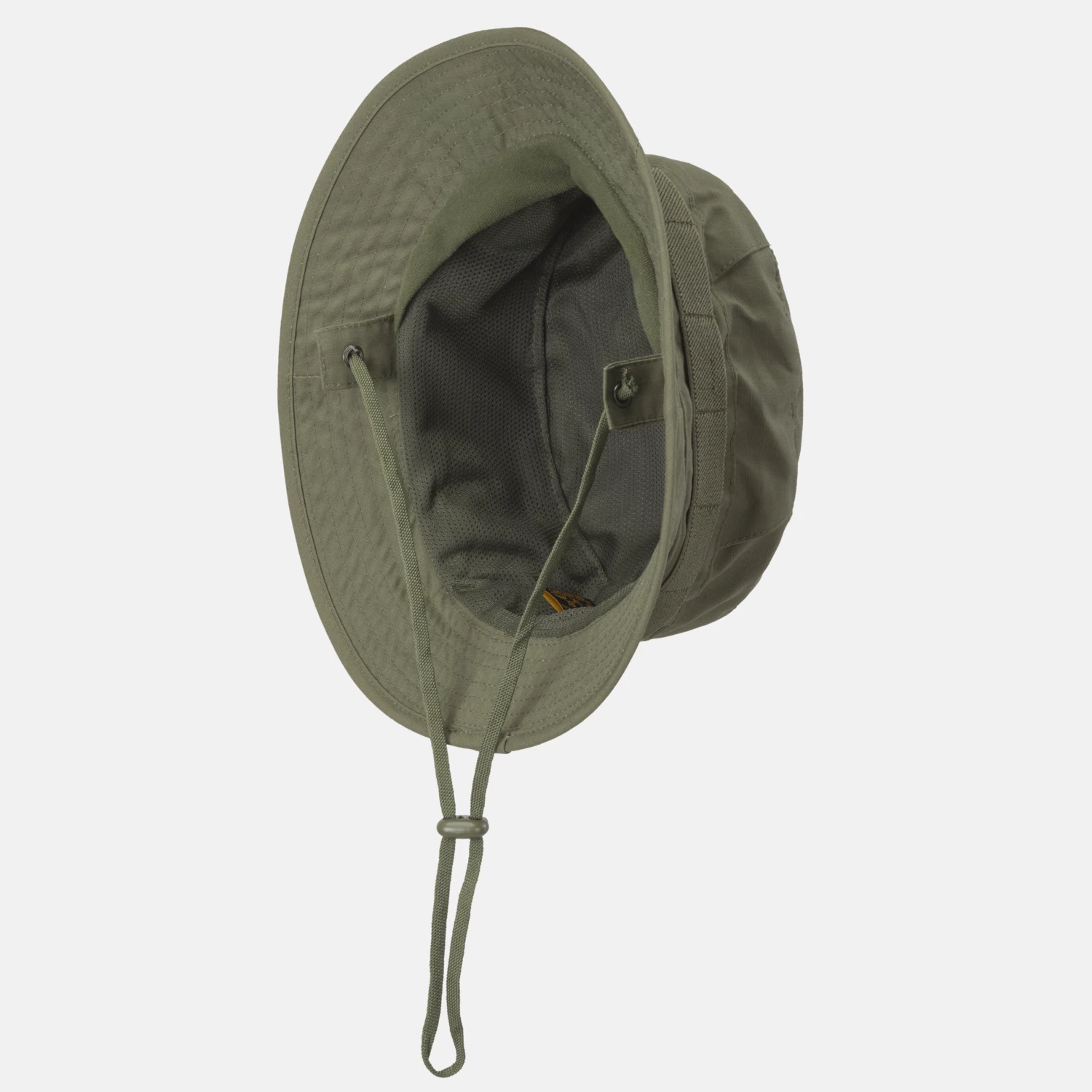 Военная каска имеет дизайн с узкими полями, вдохновленный классическими головными уборами специальных подразделений британской и австралийской армий. Эта модель обеспечивает превосходную защиту от чрезмерного солнца и дождя. Идеальная посадка на голове обеспечивается инновационной системой регулировки в виде эластичных шнурков. Кроме того, новаторские решения, такие как сетчатые туннели, гарантируют отличную циркуляцию воздуха. Незаметная потоотводящая лента впитывает пот со лба, обеспечивая комфорт при ношении тактической шапки даже в сложных климатических условиях.