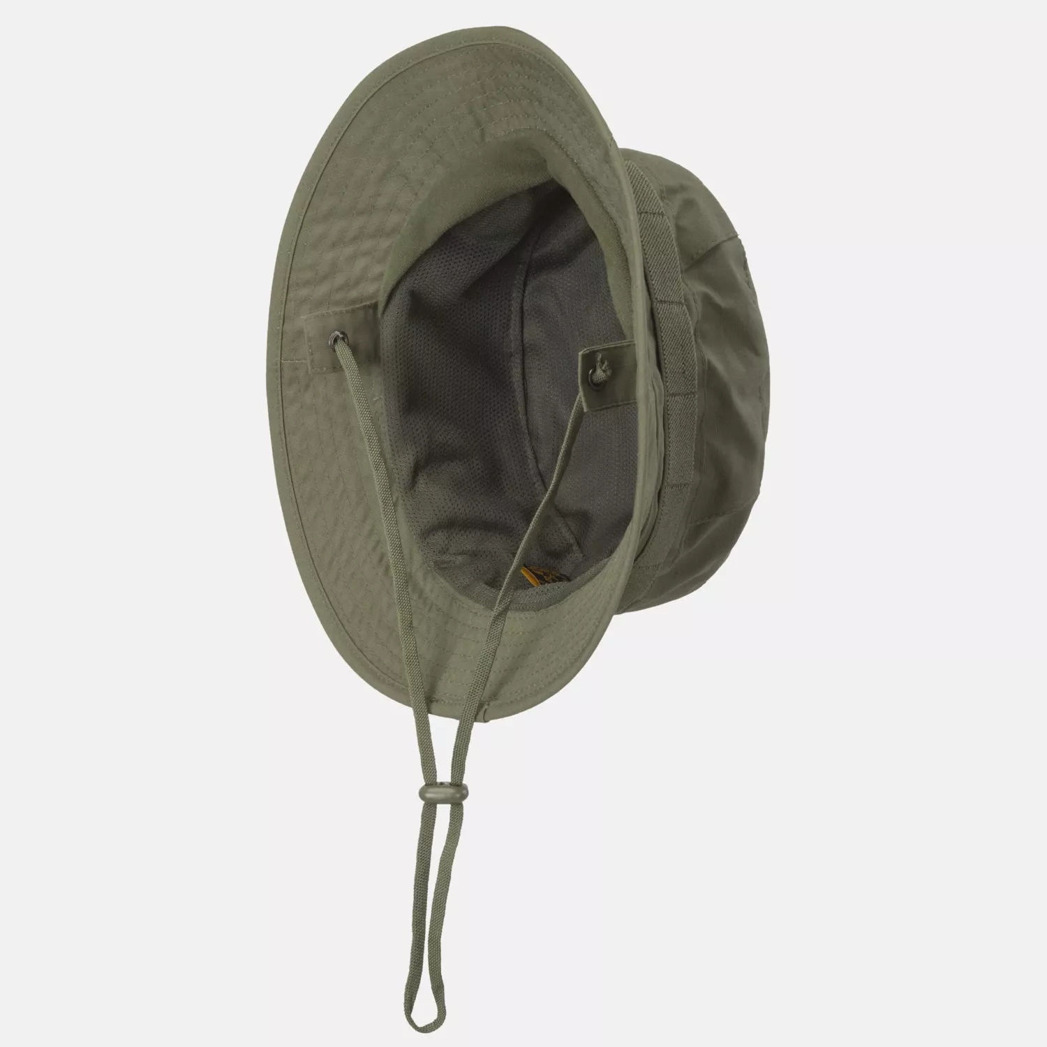 Верхняя часть шляпы включает в себя панель на липучке для крепления нашивки «свой враг». Пришитая вокруг шляпы лента позволяет прикрепить полезные предметы, такие как средство от насекомых или элементы камуфляжа. Потоотводящая лента на лбу повышает комфорт ношения, предотвращая скопление пота. Эта шляпа идеально подходит для лесной местности, являясь важным элементом маскировки головы.