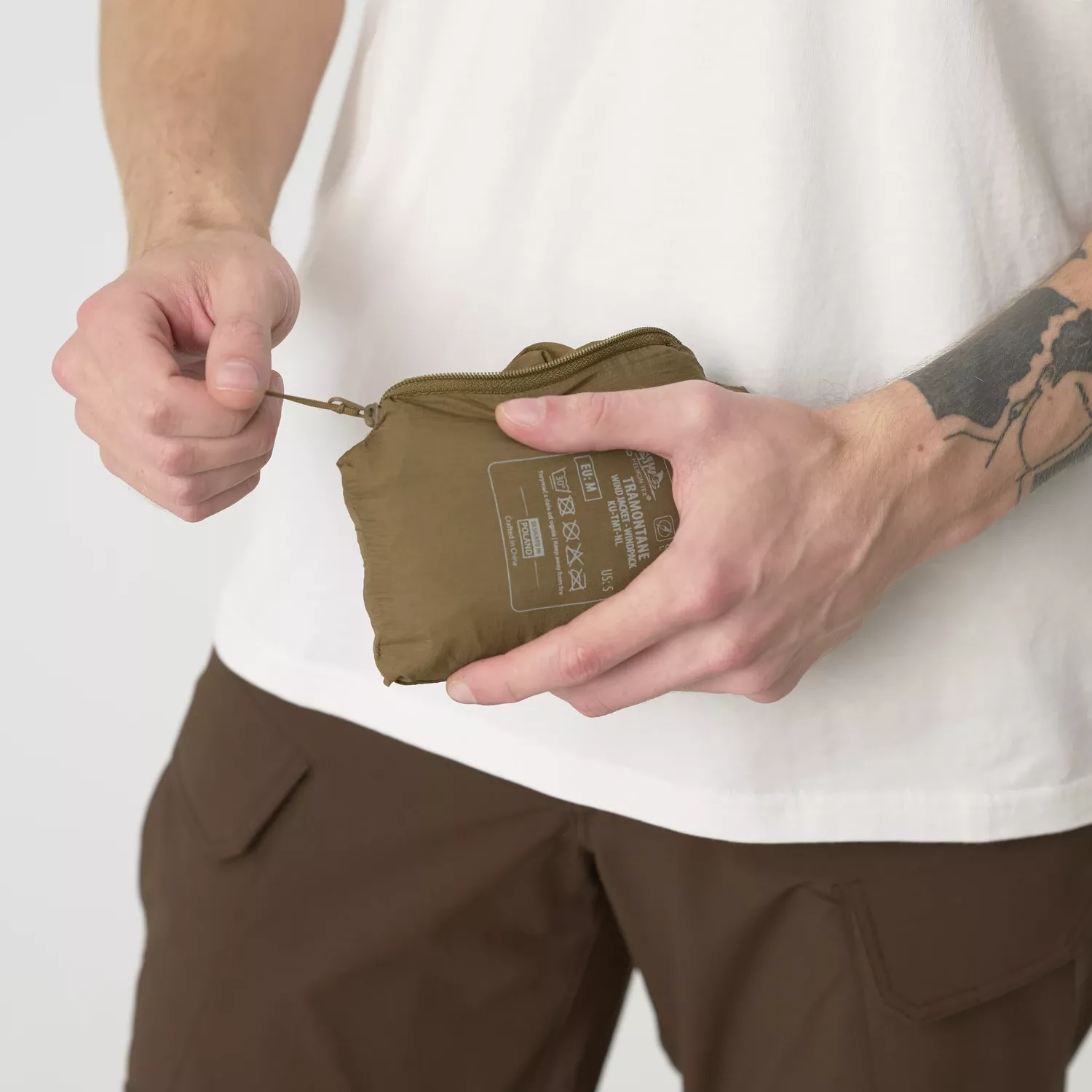 В сложенном виде куртка упаковывается в собственный нагрудный карман, который также служит чехлом для хранения. В таком виде он занимает минимум места и легко помещается в рюкзак, сумку или даже карман брюк.