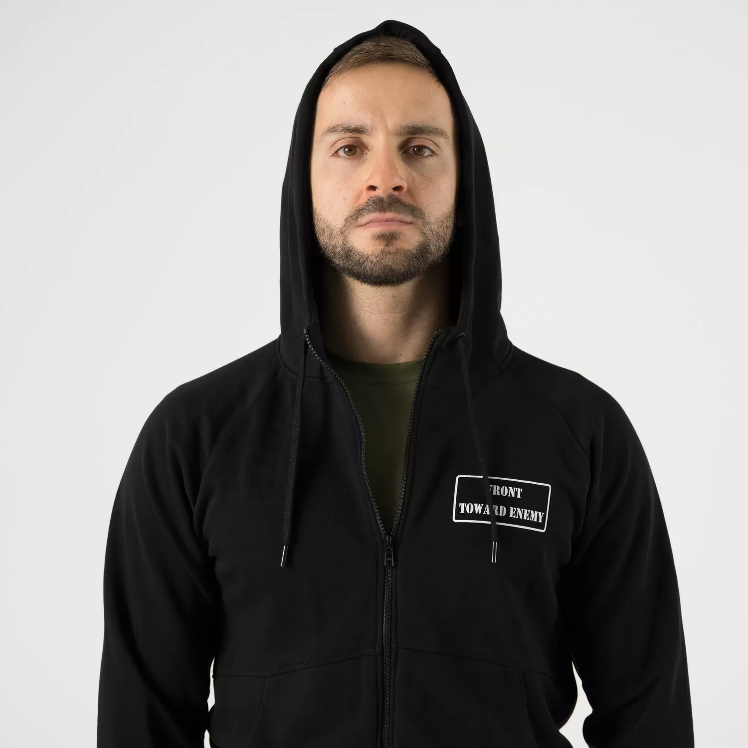 Худи (Front Toward Enemy) — это легкая толстовка на молнии с капюшоном, идеально подходящая для повседневной носки в городе. Она имеет два боковых кармана и капюшон на шнурке, обеспечивая комфорт и практичность. Принт «Front Toward Enemy» отсылает к предупреждающей надписи на минах «Клеймор» — компактных противопехотных минах, которые детонируют в одном направлении.
