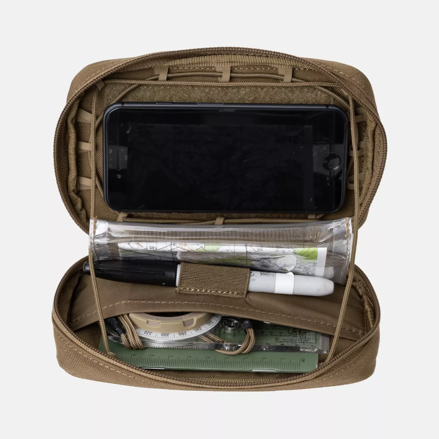 Административный чехол — это функциональный административный чехол, предназначенный для переноски навигационных и коммуникационных принадлежностей в полевых условиях. Внутри предусмотрены место для телефона и карт. Адаптер на липучке позволяет надежно закрепить телефон связи, а прозрачные отделения могут вмещать карты и заметки. Плоский карман может вместить дополнительные аксессуары, такие как небольшой блокнот или компас, а эластичная петля легко удерживает маркер. Этот тактический подсумок легко крепится с помощью системы MOLLE/PALS и идеально подходит для полевых операций.