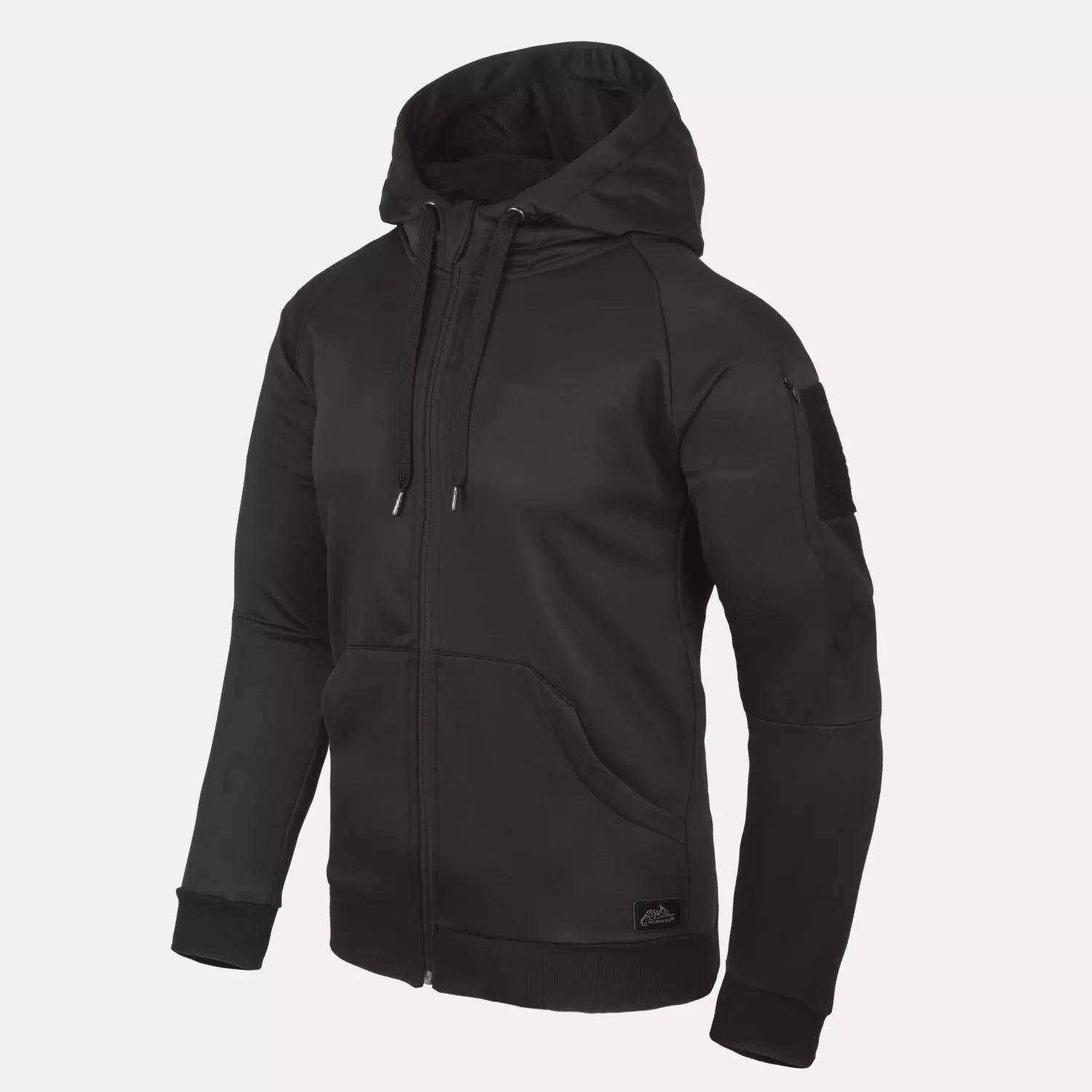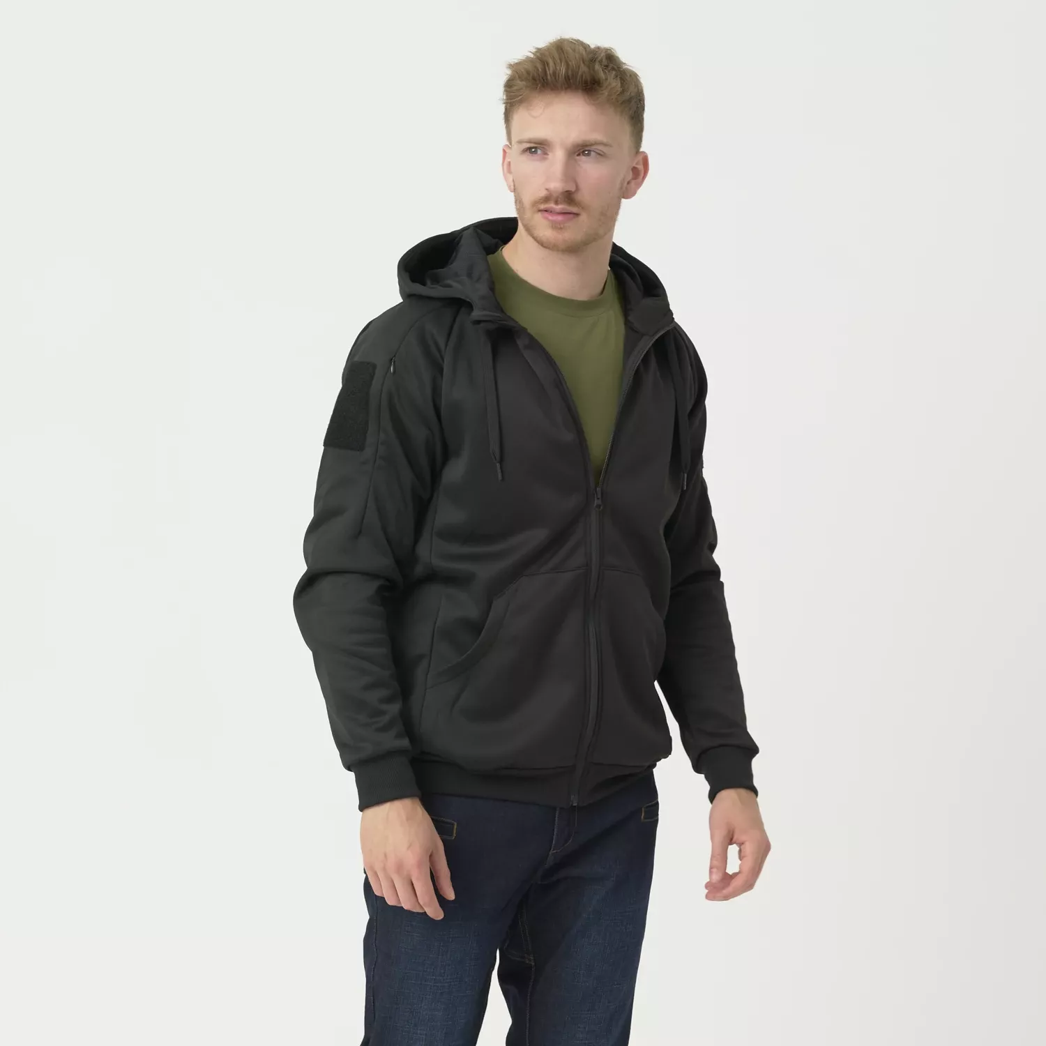 На плечах и нижней части капюшона пришиты панели на липучках, позволяющие легко персонализировать толстовку, прикрепляя эмблемы или нашивки. Капюшон регулируется и имеет дополнительную застежку-липучку. Панель с петлей, расширяющая ее функциональность. Высокая застежка-молния защищает шею и лицо от холода и других неблагоприятных погодных условий.