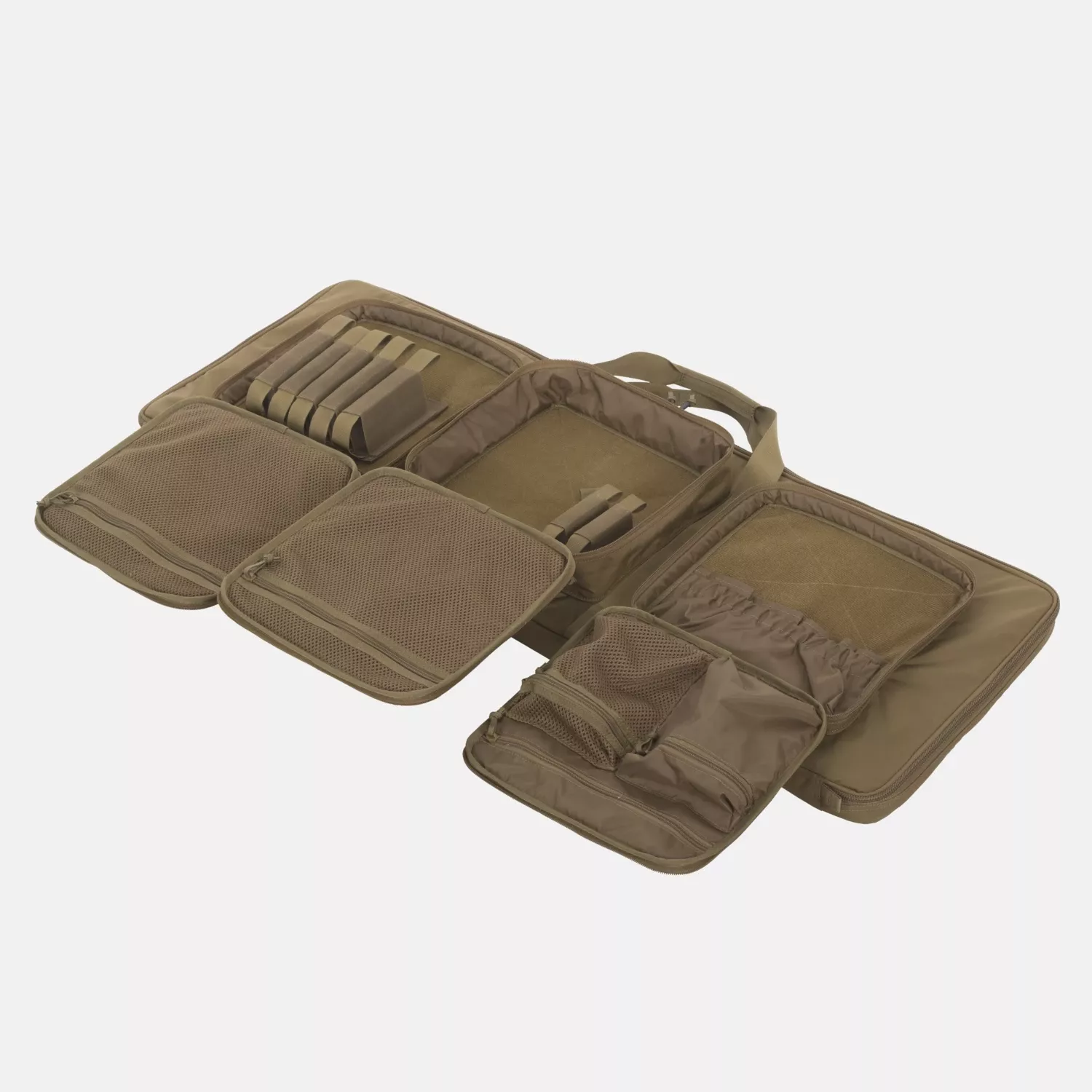 Этот чехол включает в себя множество функций, подходящих для использования на стрельбище. Его можно переносить за четыре прочные ручки или носить на спине с помощью ремней, которые можно аккуратно убрать в специальный карман, когда он не нужен. На внешней стороне этого универсального чехла расположены три больших кармана, каждый из которых имеет уникальный дизайн. Они имеют общую застежку-молнию и совместимы с крючками и ремешками. Петлевые панели для вставок VIS (Versatile Insert System).