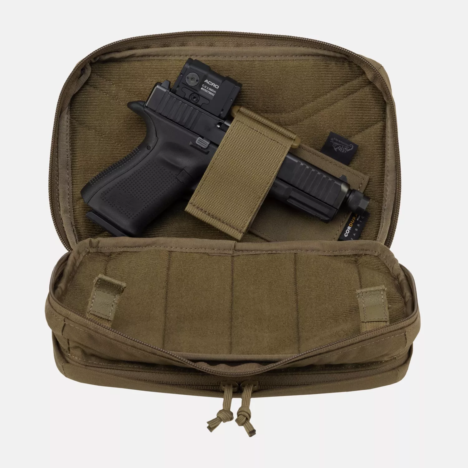 Поясная сумка Rat имеет три кармана. Первый небольшой, плоский и пришит спереди. Второй больше и содержит сетчатый карман на молнии и мягкую панель с петлями. Третий карман полностью открывается и имеет два боковых противоскользящих язычка, удобных при ношении перчаток. Он также имеет мягкие петли с обеих сторон, поэтому подходит для нашего держателя для пистолета. Совместима с нашей универсальной системой вставок. Вы можете использовать ее как органайзер для повседневного ношения или тактическую поясную сумку для оружия. Два больших кармана закрываются на двусторонние молнии, что обеспечивает быстрый доступ к содержимому.
