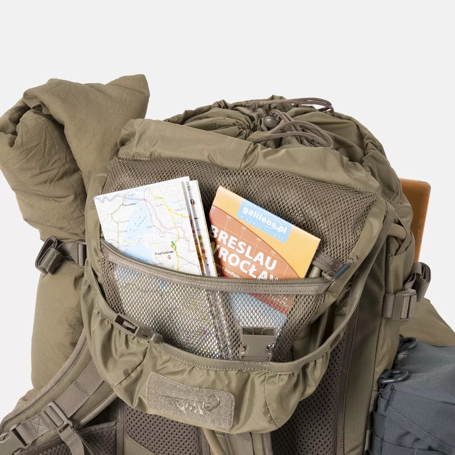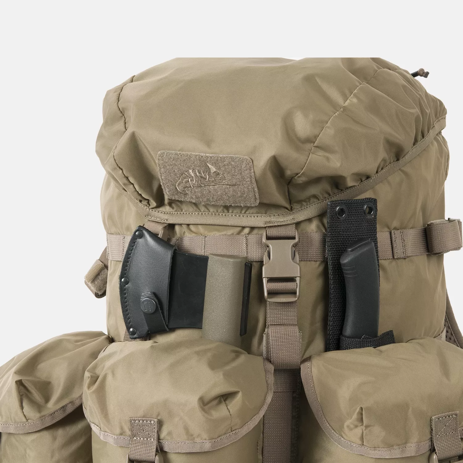 Рюкзак имеет три просторных передних кармана, застегивающихся на пряжки и оснащенных шнурками и люверсами (идеально подходит для инструментов, таких как топор). Верхний клапан включает в себя карман на молнии и панель на липучке. Внутри основного отделения стропы MOLLE/PALS позволяют организовать снаряжение с помощью вкладышей или дополнительных карманов. Боковые ремни позволяют прикрепить спальный мешок или поролоновый коврик.