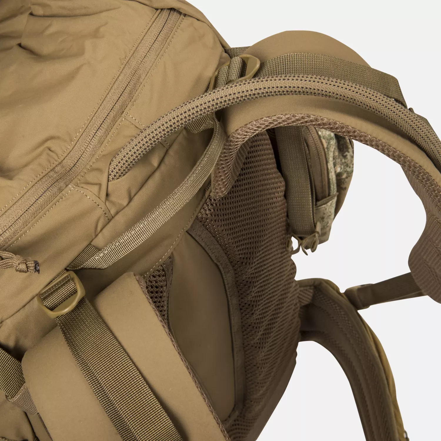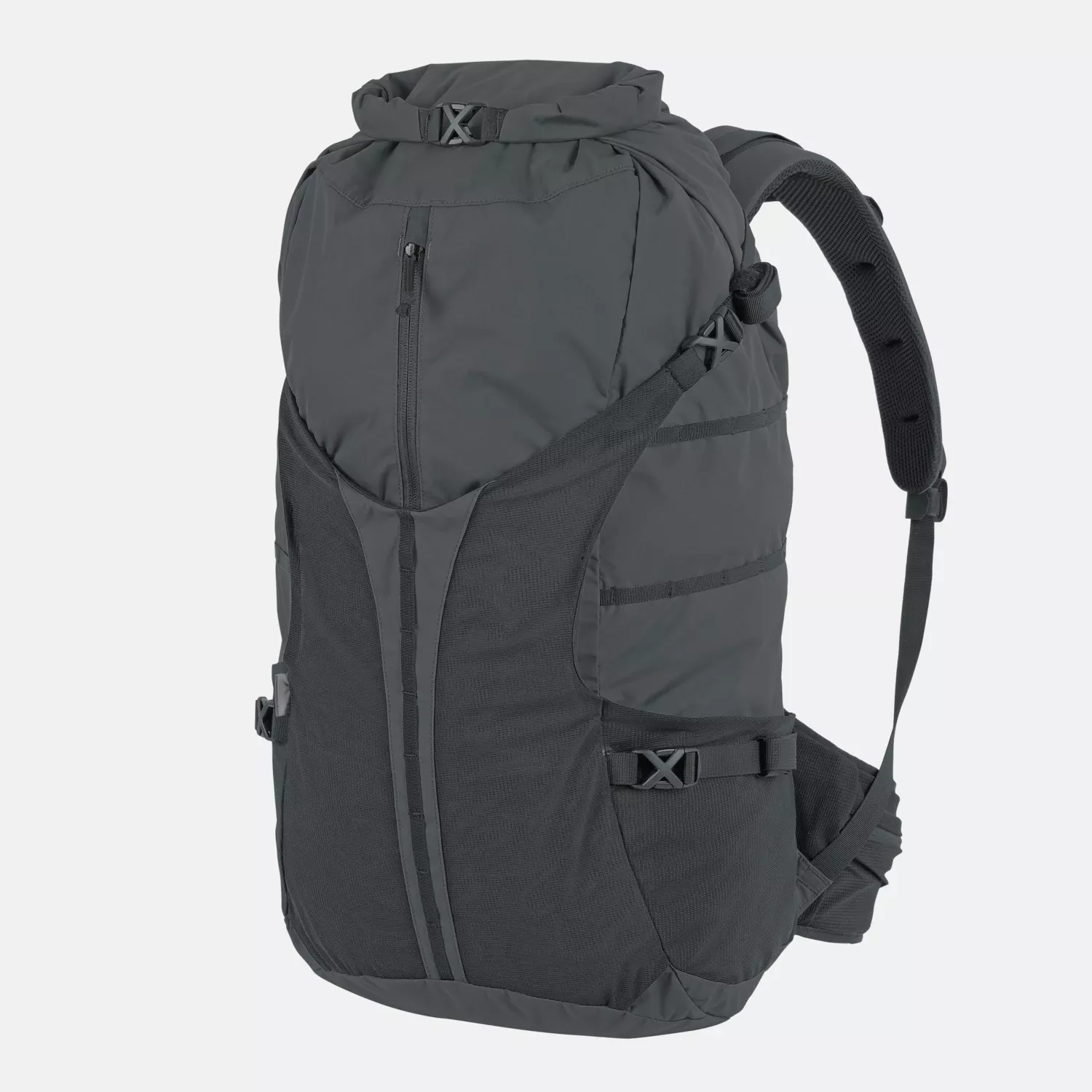 Рюкзак оснащен эргономичной подвесной системой с толстой ребристой сеткой для лучшей вентиляции и комфорта. Боковые стропы MOLLE Lite (10 мм) и «хвостовая часть» позволяют расширить конфигурацию за счет дополнительных подсумков. Боковые компрессионные ремни стабилизируют груз и уменьшают объем, когда рюкзак не полностью загружен.
