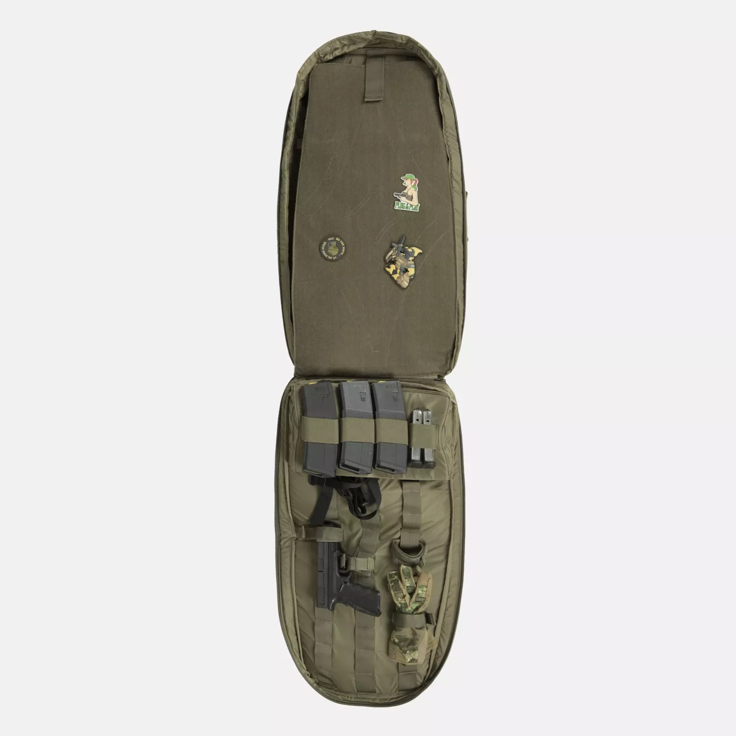 Сумка оснащена многочисленными функциями, облегчающими организацию и транспортировку: внутренние крепежные ремни, органайзер для магазинов и дополнительные внешние карманы для защиты слуха и стрелковых принадлежностей.