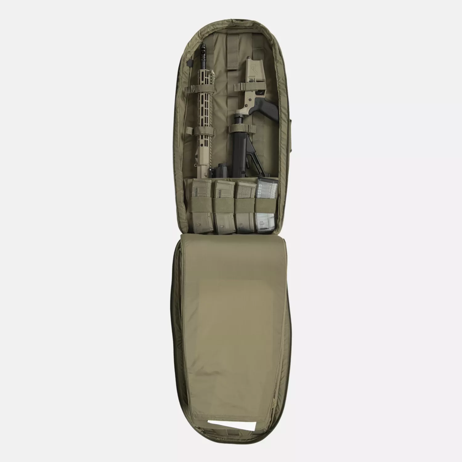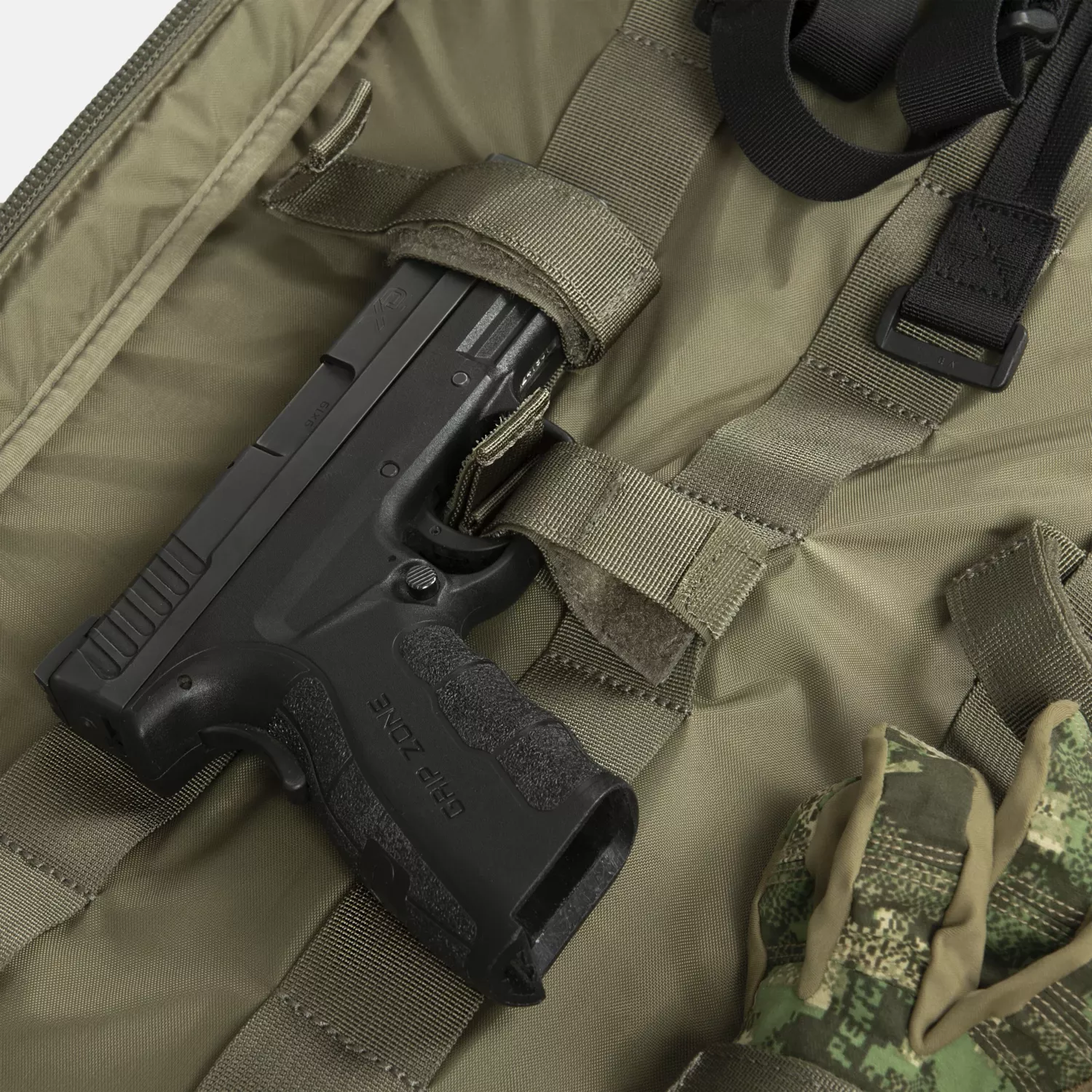 Сумка оснащена многочисленными функциями, облегчающими организацию и транспортировку: внутренние крепежные ремни, органайзер для магазинов и дополнительные внешние карманы для защиты слуха и стрелковых принадлежностей.