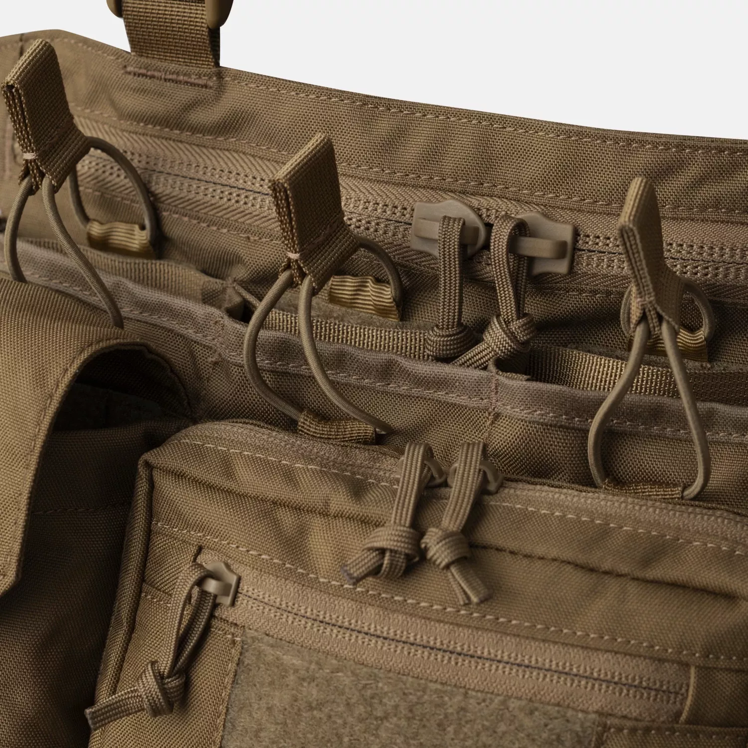 По обе стороны от административного кармана расположены два универсальных кармана с пряжками, подходящих для осколочных или дымовых гранат, и вмещают два пистолетных магазина при использовании вставок из серии Competition.