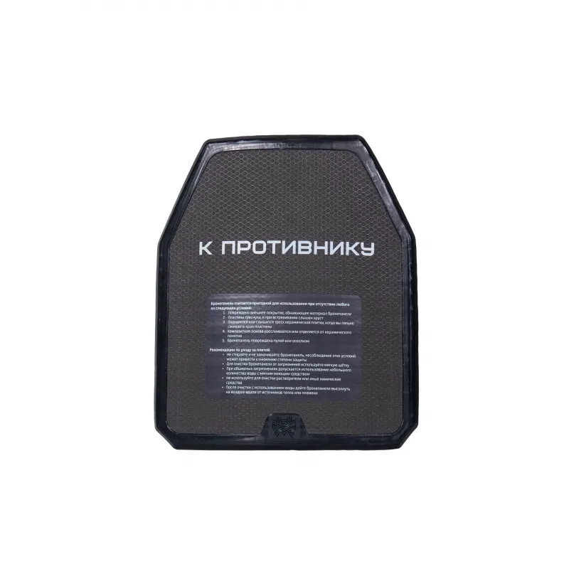 Сертифицированная бронепанель уровня защиты Бр4+, выполненная из керамики на основе карбида бора (B4C) и высокомолекулярного полиэтилена (СВМПЭ). Продукт создан с применением передовых технологий и прошел полный цикл испытаний. Оптимальное сочетание защитных свойств, малого веса и эргономичной формы делает панель современным решением для индивидуальной бронезащиты.