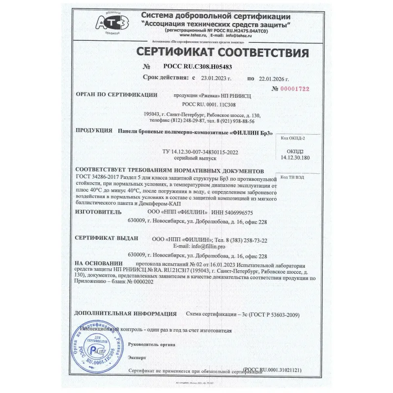 Сертификат выдан единственным в России государственным центром, аккредитованным Росстандартом по полному спектру методов испытаний средств бронезащиты (пулестойкость, противоосколочная стойкость, заброневое воздействие).