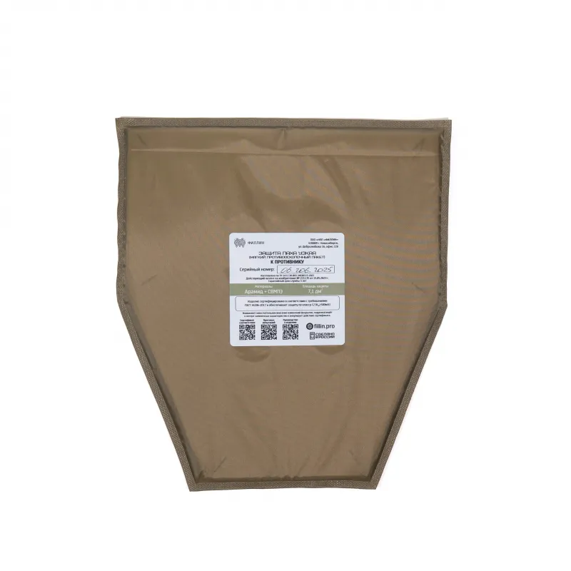 Противоосколочный пакет по классу защиты С2 для установки в чехол защиты паха узкого типа. Противоосколочный пакет состоит из комбинации слоёв СВМПЭ и арамидных тканей. Пакет герметично упакован в водонепроницаемую ткань с мембранными свойствами. По все пакеты запаиваются ультразвуковой машиной для предотвращения попадания влаги внутрь.