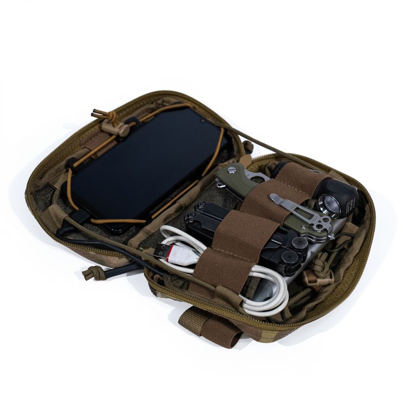 Подсумок для переноски карты, необходимых мелочей, отлично подходящий для размещения на груди бронежилета за счёт своей низкопрофильности. Благодаря съёмному внутреннему креплению, внутри подсумка можно закрепить мобильный телефон с установленными картами. Дополнительный комфорт при работе с телефоном также обеспечит возможность переноски повербанка, с выводом под провода к телефону, и возможность регулировки угла откидывания подсумка, что позволяет не беспокоиться за потерю имущества при незакрытой молнии. Также, подсумок комплектуется чехлом под карту из прозрачного материала, не ломающимся на морозе. Наружная сторона подсумка имеет молле-ячейки, а также велкро-панель. Снаружи подсумка также можно крепить карабины, маркеры и химические источники света.