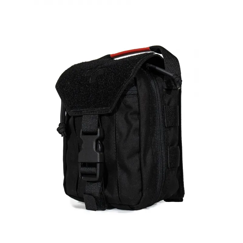 Аптечка состоит из двух основных частей — платформы и подсумка с органайзером. Платформа фиксируется на крепление MOLLE и совмещается через велкро-панель с задней стороной подсумка. За счет этого, конструкцию можно легко и быстро разъединить. Для предотвращения произвольного отделения подсумка от платформы, используется стропа-утяжка с пластиковой застежкой фастекс. На замках есть удобные язычки для работы в перчатках.