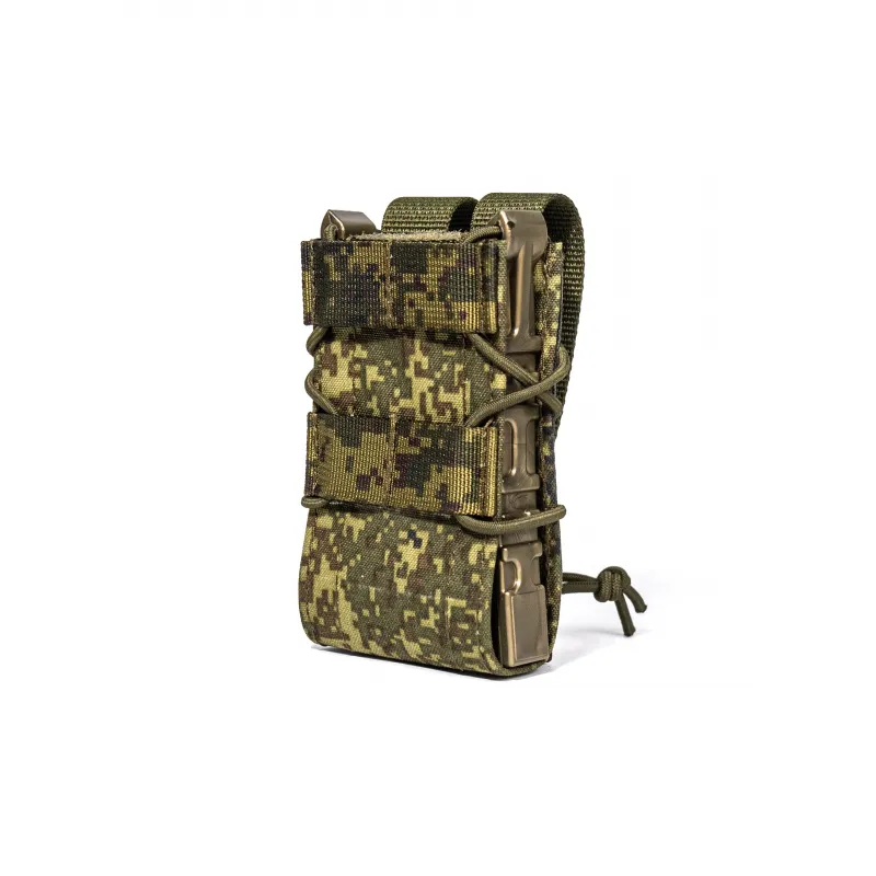 Подсумок, разработанный для «быстрой» работы. Классический дизайн, простая конструкция и максимальная надёжность. Подсумки данной серии надёжно удерживают содержимое и оставляют возможность быстрого извлечения. За счет гибкой регулировки эластичным шнуром, возможна эксплуатация с различными с магазинами: АК (5.45/7.62), АС, ВСС. Особенностью конструкции являются уникальные направляющие, изготовленные из специализированного полиуретана, который не боится перепада температуры (температура эксплуатации от -60 °С до +90 °С), при этом сохраняет превосходное сцепление с магазином, гибкость и устойчивость к износу на всем указанном диапазоне.