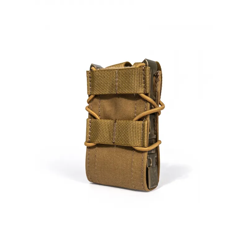 Подсумок, разработанный для «быстрой» работы. Классический дизайн, простая конструкция и максимальная надёжность. Подсумки данной серии надёжно удерживают содержимое и оставляют возможность быстрого извлечения. За счет гибкой регулировки эластичным шнуром, возможна эксплуатация с различными с магазинами: АК (5.45/7.62), АС, ВСС. Особенностью конструкции являются уникальные направляющие, изготовленные из специализированного полиуретана, который не боится перепада температуры (температура эксплуатации от -60 °С до +90 °С), при этом сохраняет превосходное сцепление с магазином, гибкость и устойчивость к износу на всем указанном диапазоне.