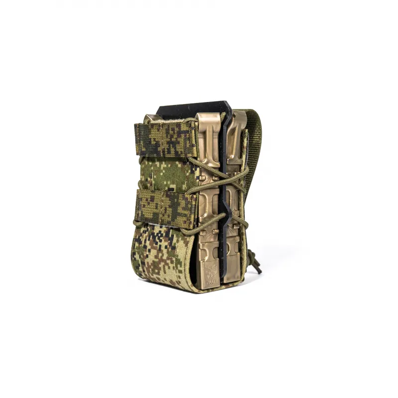 Подсумок, разработанный для «быстрой» работы. Классический дизайн, простая конструкция и максимальная надёжность. Подсумки данной серии надёжно удерживают содержимое и оставляют возможность быстрого извлечения. За счет гибкой регулировки эластичным шнуром, возможна эксплуатация с различными с магазинами: АК (5.45/7.62), АС, ВСС. Особенностью конструкции являются уникальные направляющие, изготовленные из специализированного полиуретана, который не боится перепада температуры (температура эксплуатации от -60 °С до +90 °С), при этом сохраняет превосходное сцепление с магазином, гибкость и устойчивость к износу на всем указанном диапазоне.