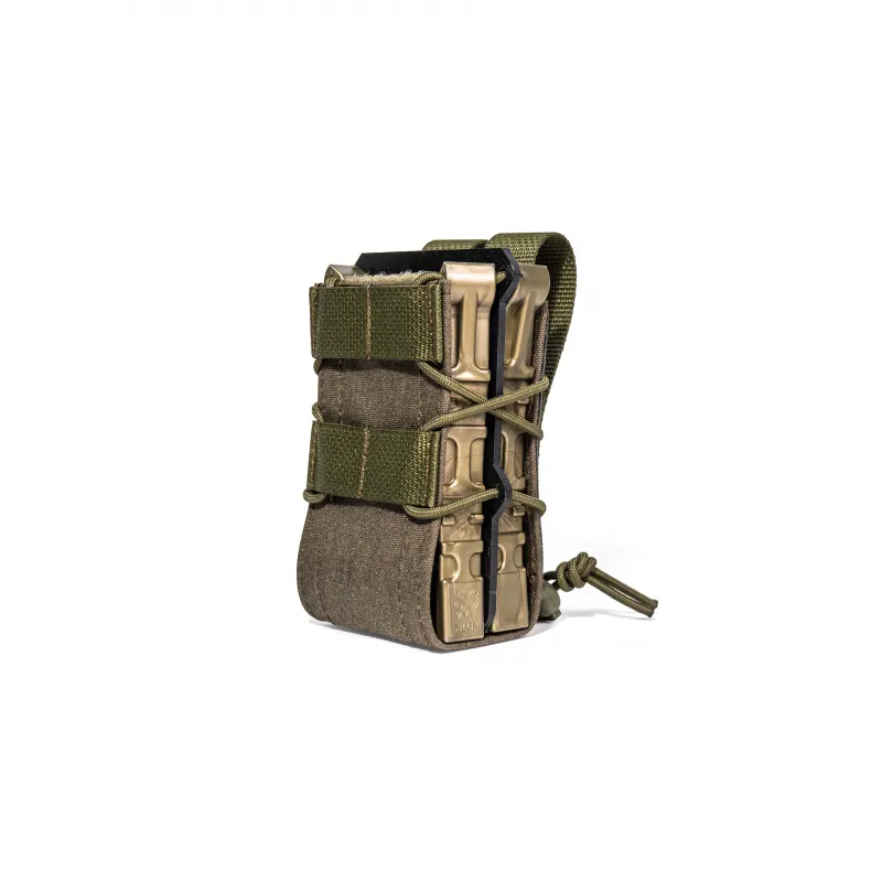 Подсумок, разработанный для «быстрой» работы. Классический дизайн, простая конструкция и максимальная надёжность. Подсумки данной серии надёжно удерживают содержимое и оставляют возможность быстрого извлечения. За счет гибкой регулировки эластичным шнуром, возможна эксплуатация с различными с магазинами: АК (5.45/7.62), АС, ВСС. Особенностью конструкции являются уникальные направляющие, изготовленные из специализированного полиуретана, который не боится перепада температуры (температура эксплуатации от -60 °С до +90 °С), при этом сохраняет превосходное сцепление с магазином, гибкость и устойчивость к износу на всем указанном диапазоне.