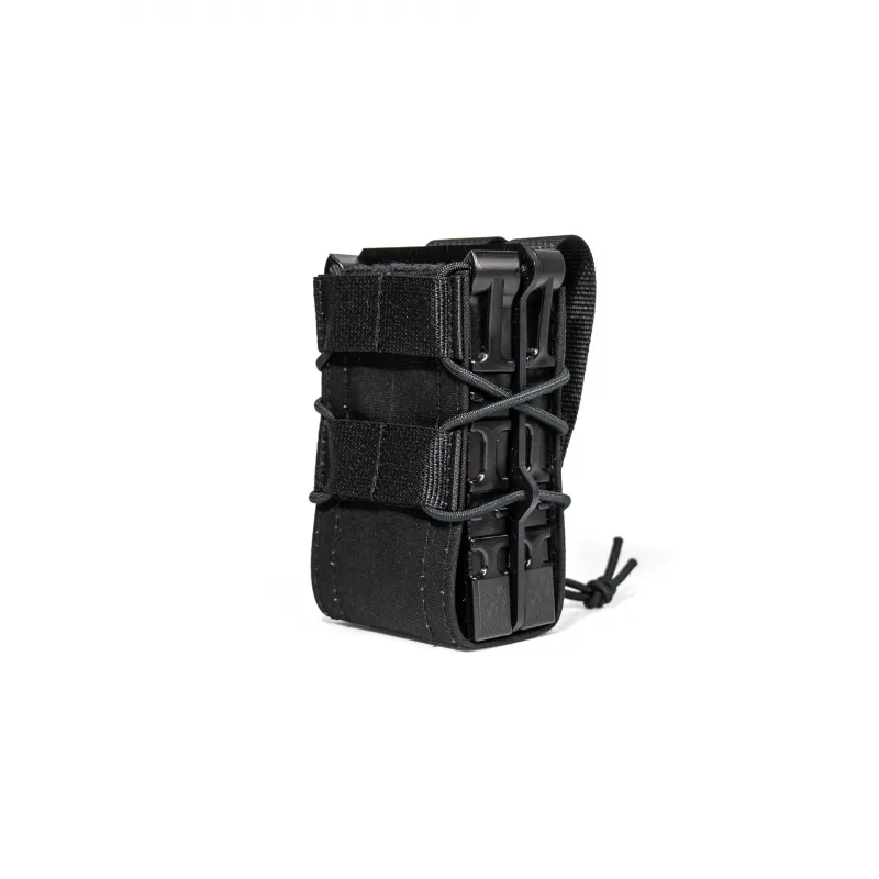 Подсумок, разработанный для «быстрой» работы. Классический дизайн, простая конструкция и максимальная надёжность. Подсумки данной серии надёжно удерживают содержимое и оставляют возможность быстрого извлечения. За счет гибкой регулировки эластичным шнуром, возможна эксплуатация с различными с магазинами: АК (5.45/7.62), АС, ВСС. Особенностью конструкции являются уникальные направляющие, изготовленные из специализированного полиуретана, который не боится перепада температуры (температура эксплуатации от -60 °С до +90 °С), при этом сохраняет превосходное сцепление с магазином, гибкость и устойчивость к износу на всем указанном диапазоне.