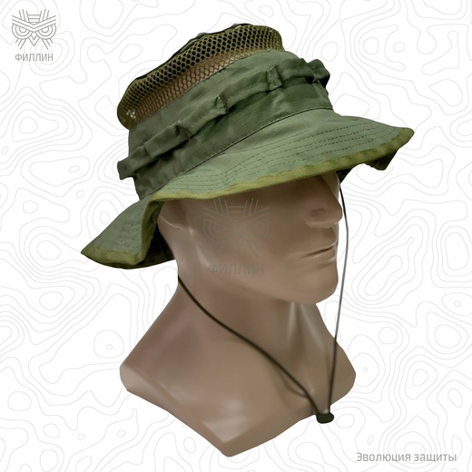 Панама для жаркого климата. Позволяет защитить голову от перегрева на солнце. Идеально подходит к маскировочным халатам «Туман». Не имеет размера — регулируется по объёму при помощи утяжки на затылке. Сверху и на боках панамы нашиты стропы из ткани для крепления листьев и травы, чтобы лучше соответствовать местности.