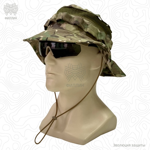 Панама для жаркого климата. Позволяет защитить голову от перегрева на солнце. Идеально подходит к маскировочным халатам «Туман». Не имеет размера — регулируется по объёму при помощи утяжки на затылке. Сверху и на боках панамы нашиты стропы из ткани для крепления листьев и травы, чтобы лучше соответствовать местности.