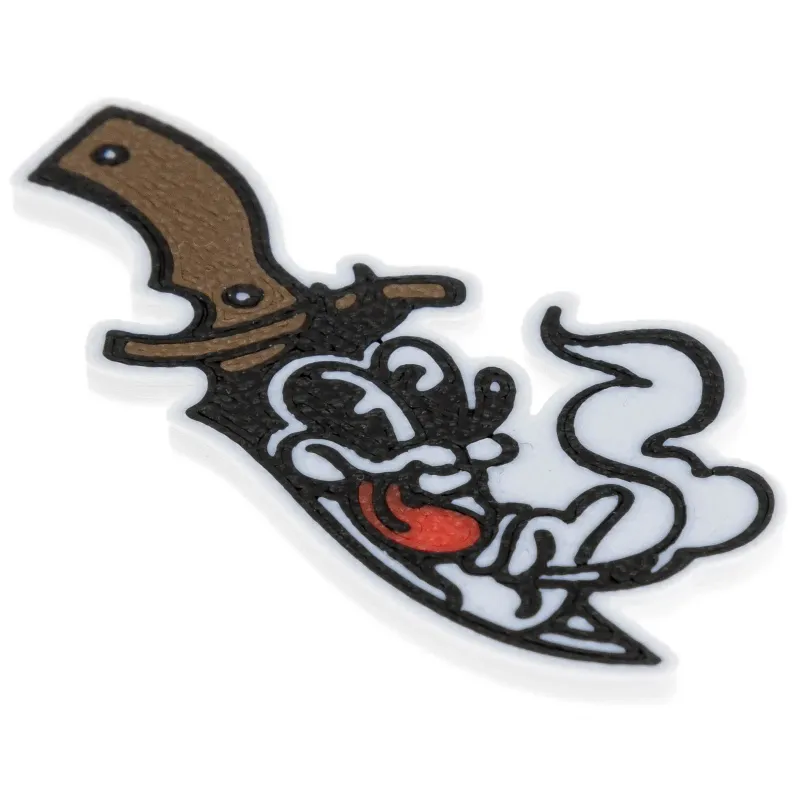 Велкро патч "Хитрый кинжал" от компании Error — это невероятно харизматичный и дерзкий аксессуар, выполненный в неподражаемой эстетике анимации Rubber Hose 1930-х годов. Дизайн представляет собой оживший кинжал с хитрой ухмылкой, высунутым языком и клубами дыма, нарисованный с использованием жирного черного контура. Этот пластиковый патч с выраженной текстурой легко крепится на любую текстильную поверхность благодаря надежной липучке.