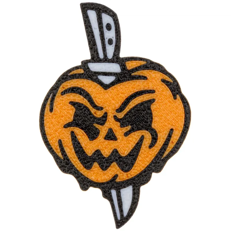 Велкро патч Злая тыква от компании Error — это зловещий и стильный аксессуар, выполненный в узнаваемой эстетике Rubber Hose и классического хоррора. Дизайн изображает злобную ухмыляющуюся тыкву, пронзенную насквозь кинжалом. Яркий оранжевый цвет, контрастирующий с черным фоном, и жирный контур создают эффект винтажной наклейки 30-х годов. Этот пластиковый патч легко крепится на любую текстильную поверхность благодаря качественной липучке.