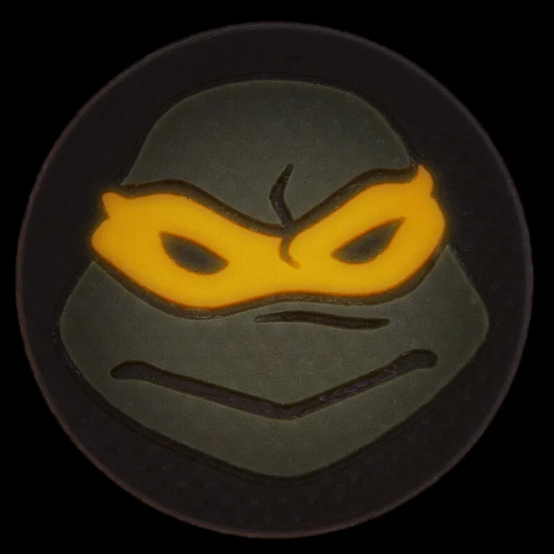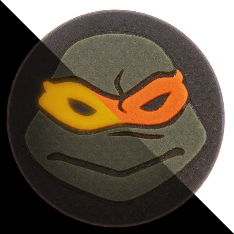 Необычный патч от Stabwoodstone, выполненный из G10 с рисунком из люминофора, светящегося в темноте. На рисунке изображен Майки, один из четырёх черепашек-ниндзя.