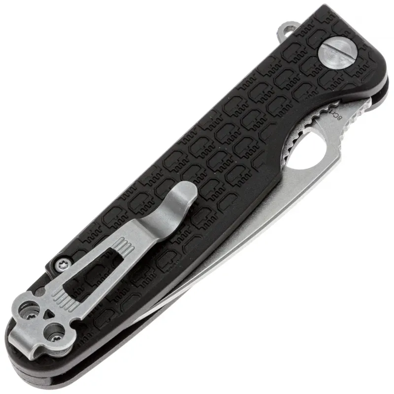 Рукоять выполнена из FRN — современного высокотехнологичного материала, который обеспечивает оптимальное сочетание лёгкости, прочности и устойчивости к внешним воздействиям. FRN отличается превосходной ударопрочностью, коррозионной стойкостью и минимальным весом, что делает нож удобным для ежедневного ношения. Рукоять ножа выполнена с учётом эргономических требований, обеспечивая комфортный хват несмотря на компактные размеры. Продуманная геометрия рукояти гарантирует надёжное удержание ножа в руке при любых условиях использования, а качественная обработка всех поверхностей делает нож приятным в эксплуатации. Для удобства ношения нож оснащён реверсивной клипсой, которую можно переставить как для правостороннего, так и для левостороннего крепления, что делает его универсальным для пользователей с любой ведущей рукой. Также предусмотрено темлячное отверстие для крепления страховочного шнура, что повышает безопасность использования ножа в экстремальных условиях и исключает возможность его потери.