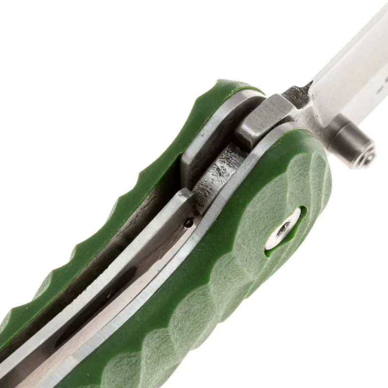 Клинок ножа выполнен в форме drop-point — это один из самых популярных профилей, обеспечивающий универсальность при резке и уколе. В качестве стали использована 440 — недорогой, но надёжный нержавеющий сплав, устойчивый к коррозии и легко поддающийся заточке даже в полевых условиях. Это делает нож особенно удобным для новичков и тех, кто предпочитает простоту в обслуживании. Поверхность клинка обработана в технике stonewash, что придаёт ему немаркий, матовый вид и хорошо маскирует мелкие царапины от использования. Спуски начинаются с половины высоты клинка, что даёт хороший баланс между резом и прочностью. Открытие осуществляется с помощью удобного шпенька, а за фиксацию отвечает проверенный временем замок liner-lock.